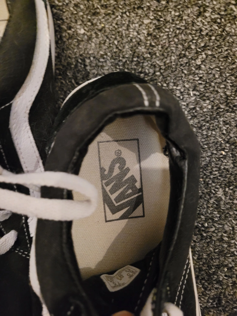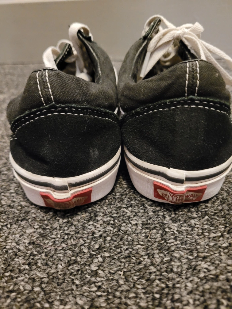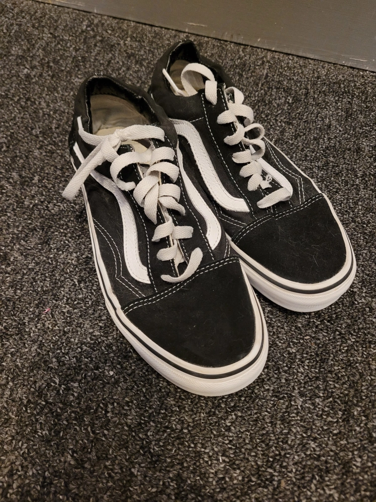 Pre-owned black Vans Old Skool sneakers. Classic design, low-top style. White side stripes and laces. Waffle sole. Some wear **** Cash Only **** **** Pickup Only **** **** No E-transfers **** **** Serious Inquiries Only/ Serious Offers Only ****