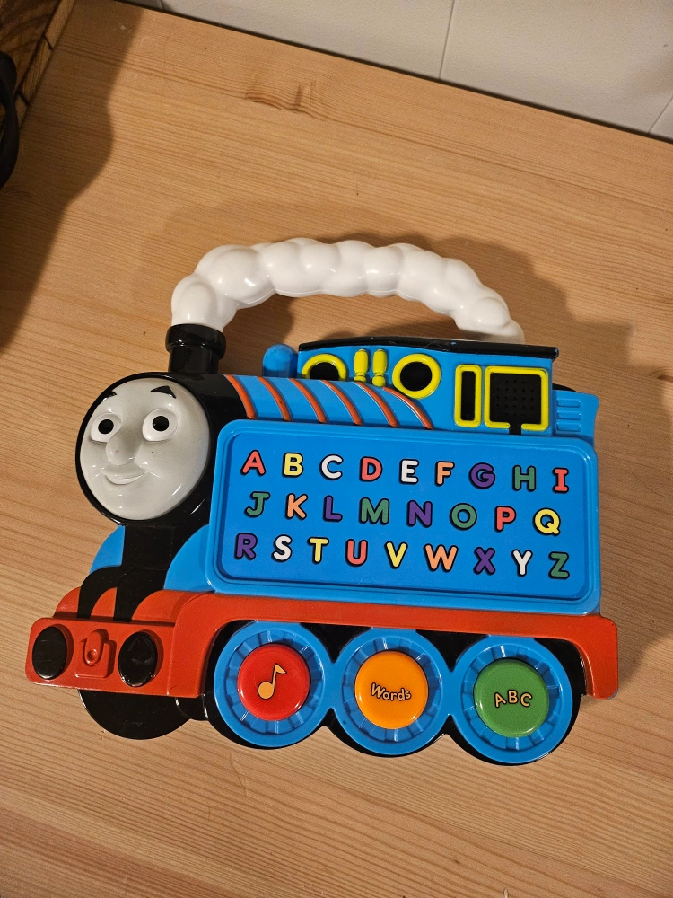 Interactive toy train. Features alphabet, words, and music. Great for toddlers. Pre-owned, shows minor wear.