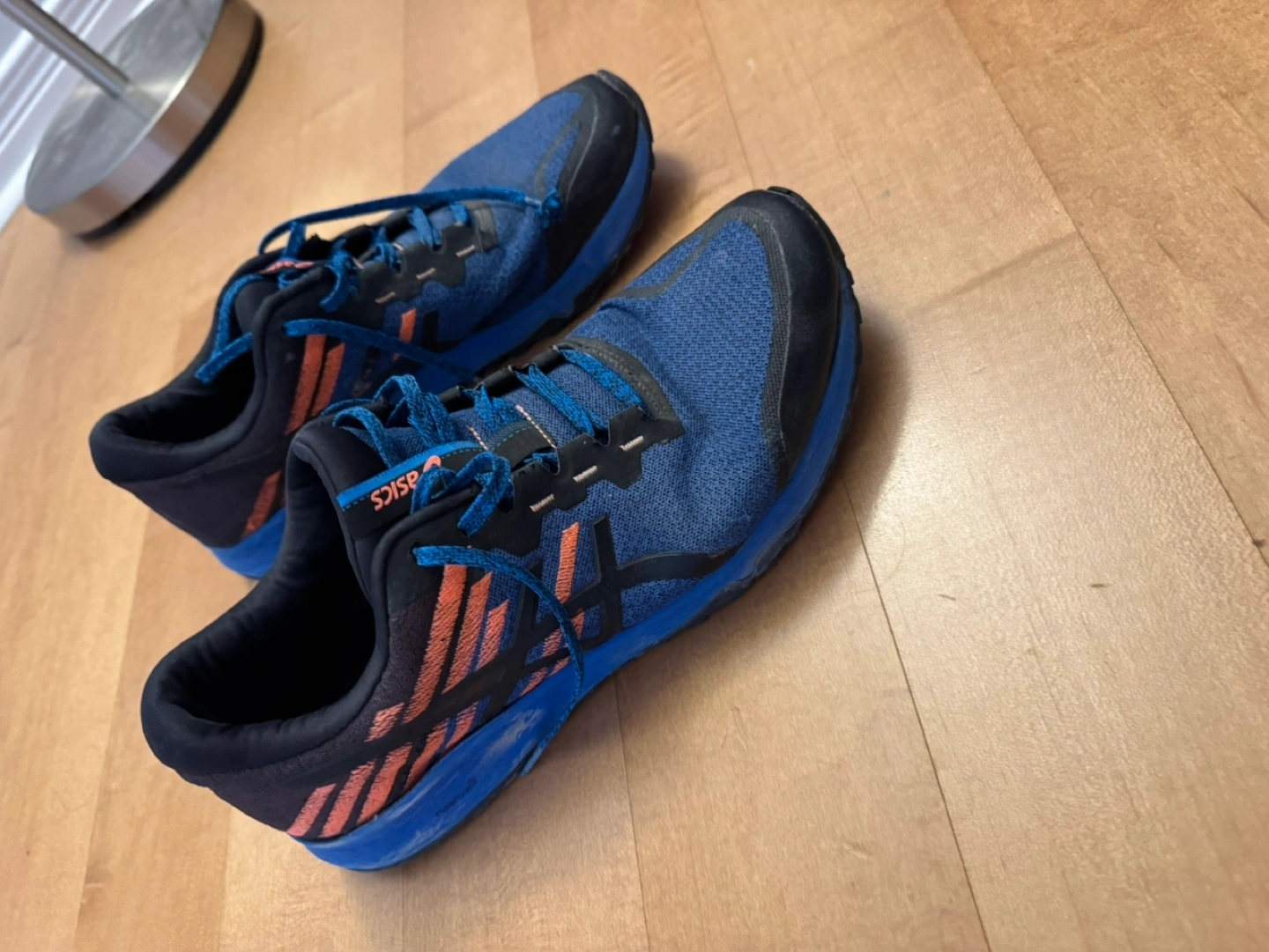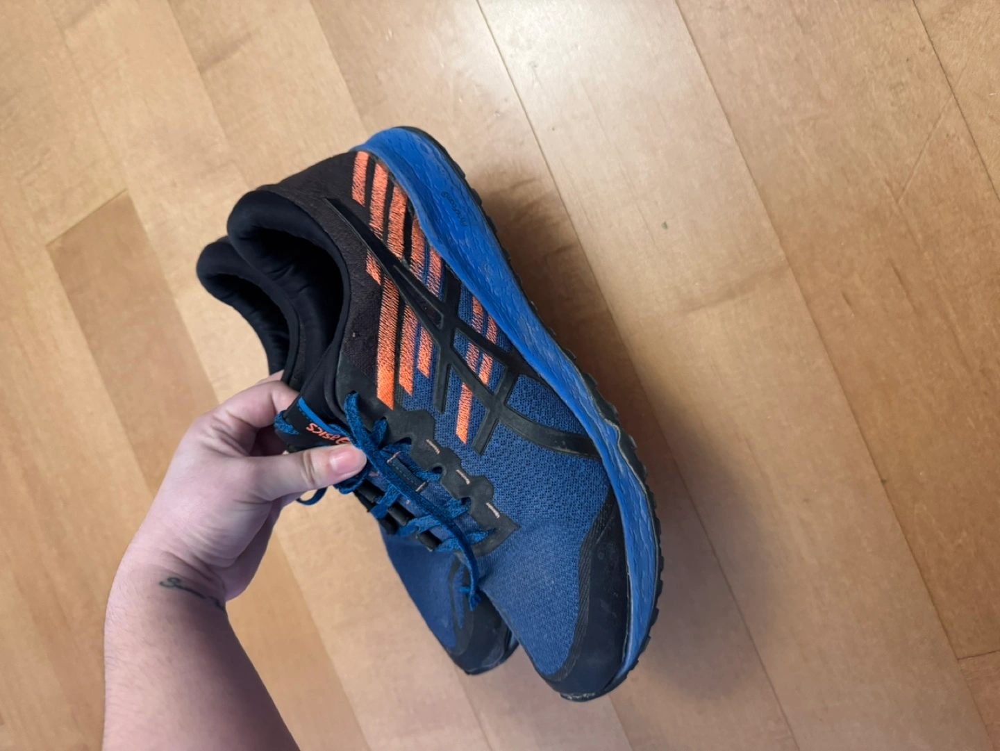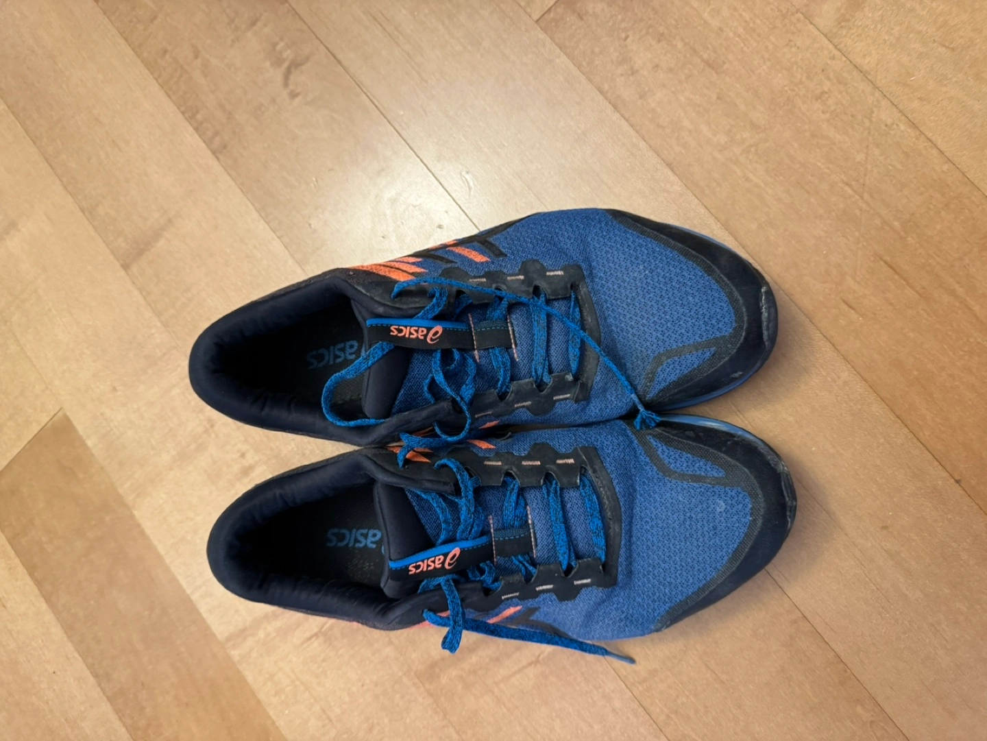 Gently used ASICS running shoes. Blue and orange color scheme. Great for multiple activities. Check pictures for details. Size 12. just wash.