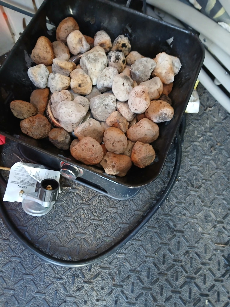 Square propane fire pit. Black metal. Includes lava rocks. Used condition. Great for the patio, beach or the cabin. roasting marshmallows with the kids.