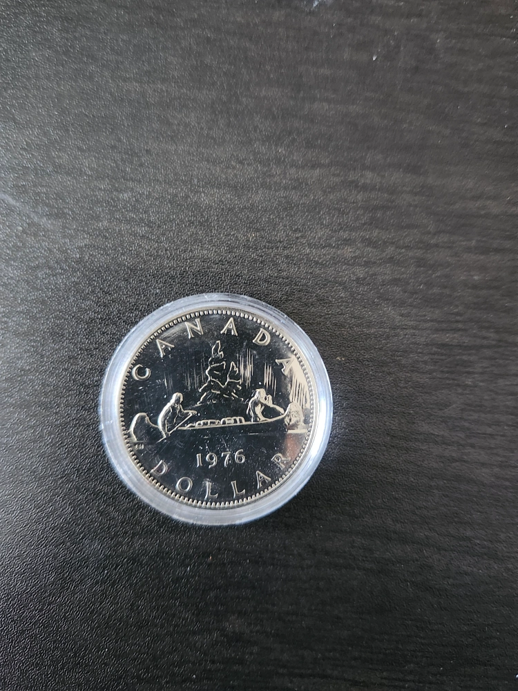 Canadian dollar coin from 1976. Features a canoe design. In plastic case.