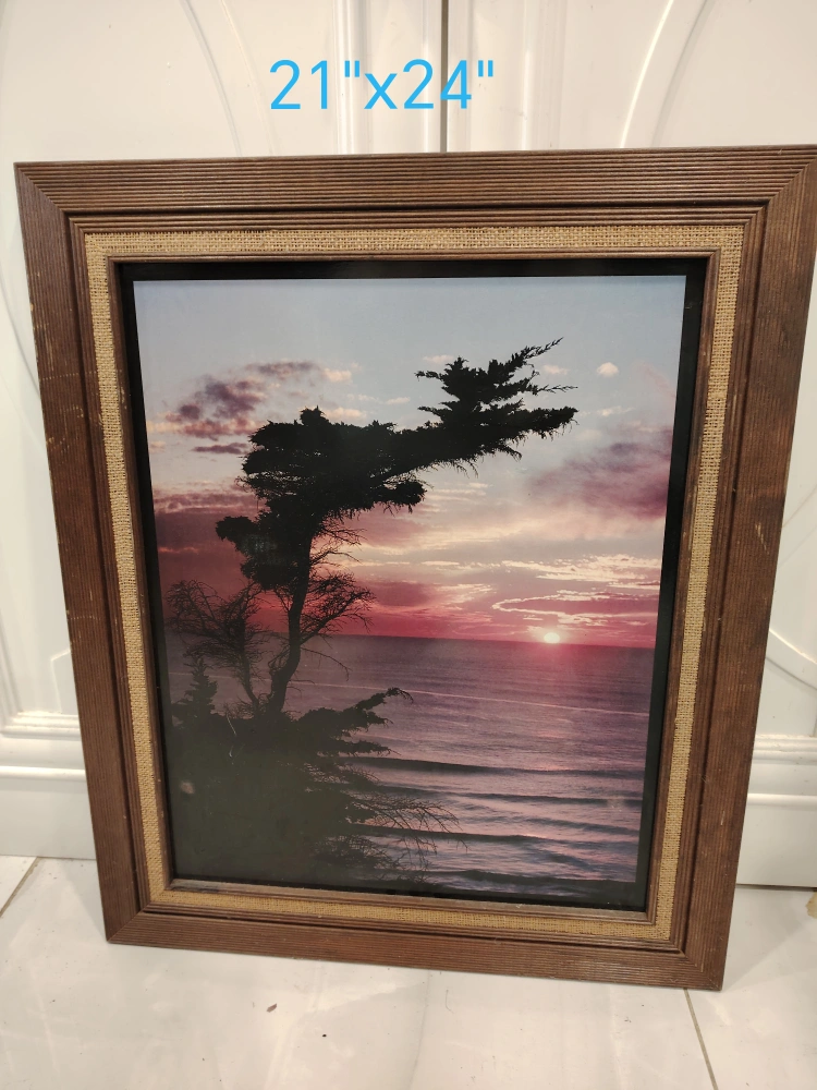 Beautiful framed print of an ocean sunset. Dark wood frame with burlap matting. Measures 21"x24".