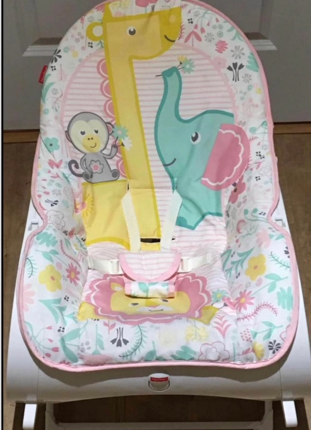 Adorable baby rocker, pink and yellow colour scheme. Features a cute jungle animal theme. Suitable for infants and toddlers. In good condition.