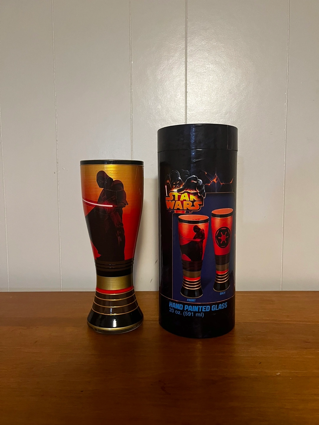Unique Star Wars hand-painted glass. One glass with two unique sides - one features Darth Vader, the other the Imperial symbol. Collectible item. Comes in original packaging. Pick Up Newtonbrook near Bathurst & Steeles