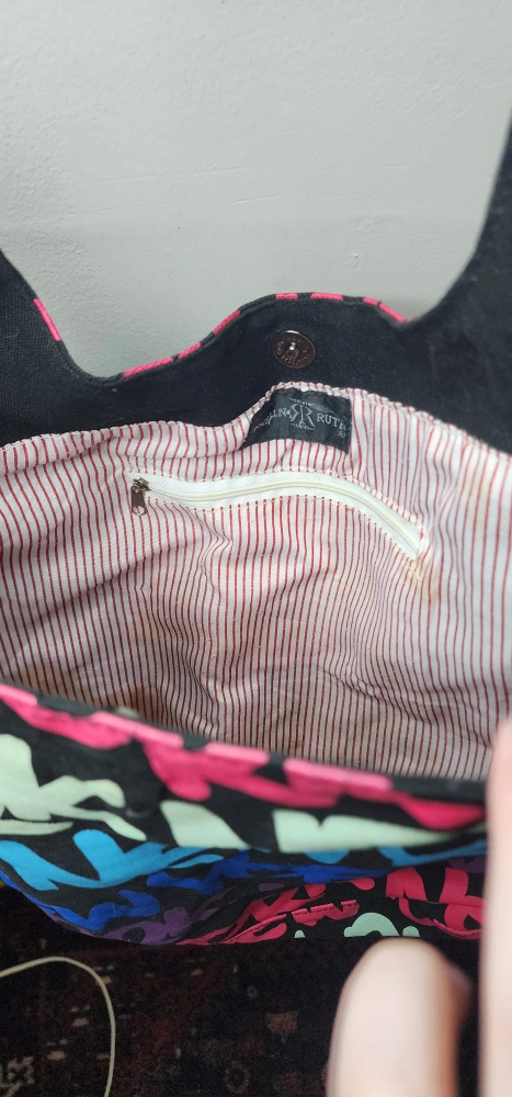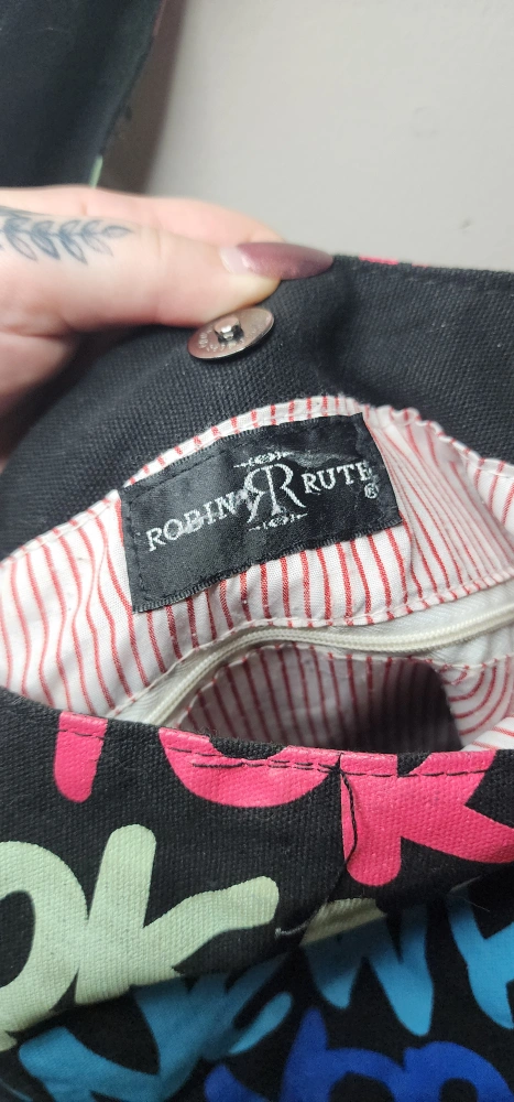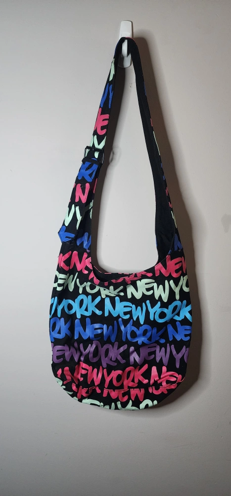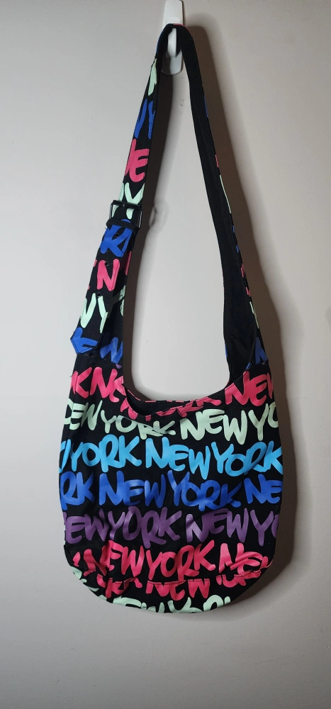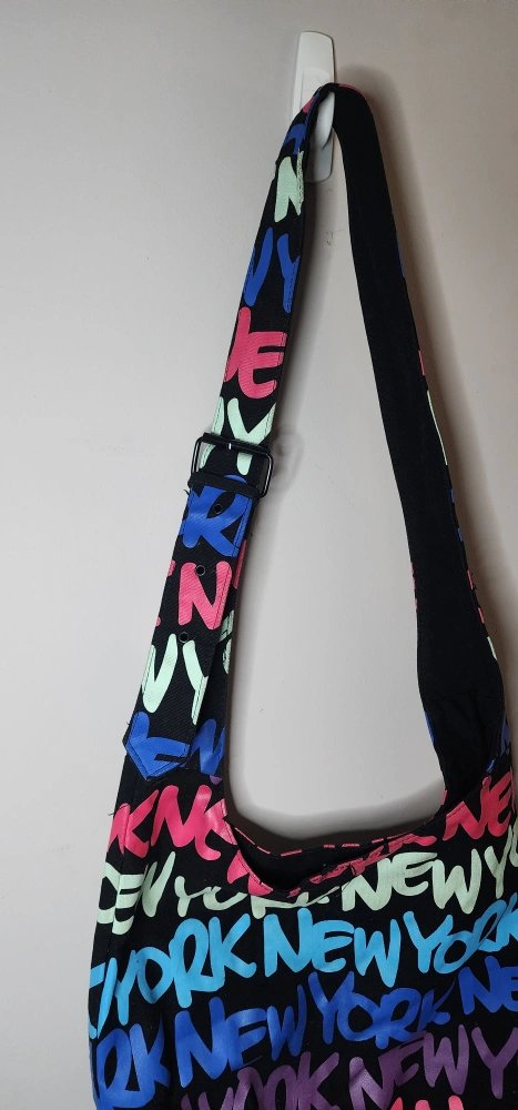 Black canvas shoulder bag. Features a colourful graffiti-style New York print. Interior features a zippered pocket and striped lining. Adjustable shoulder strap.