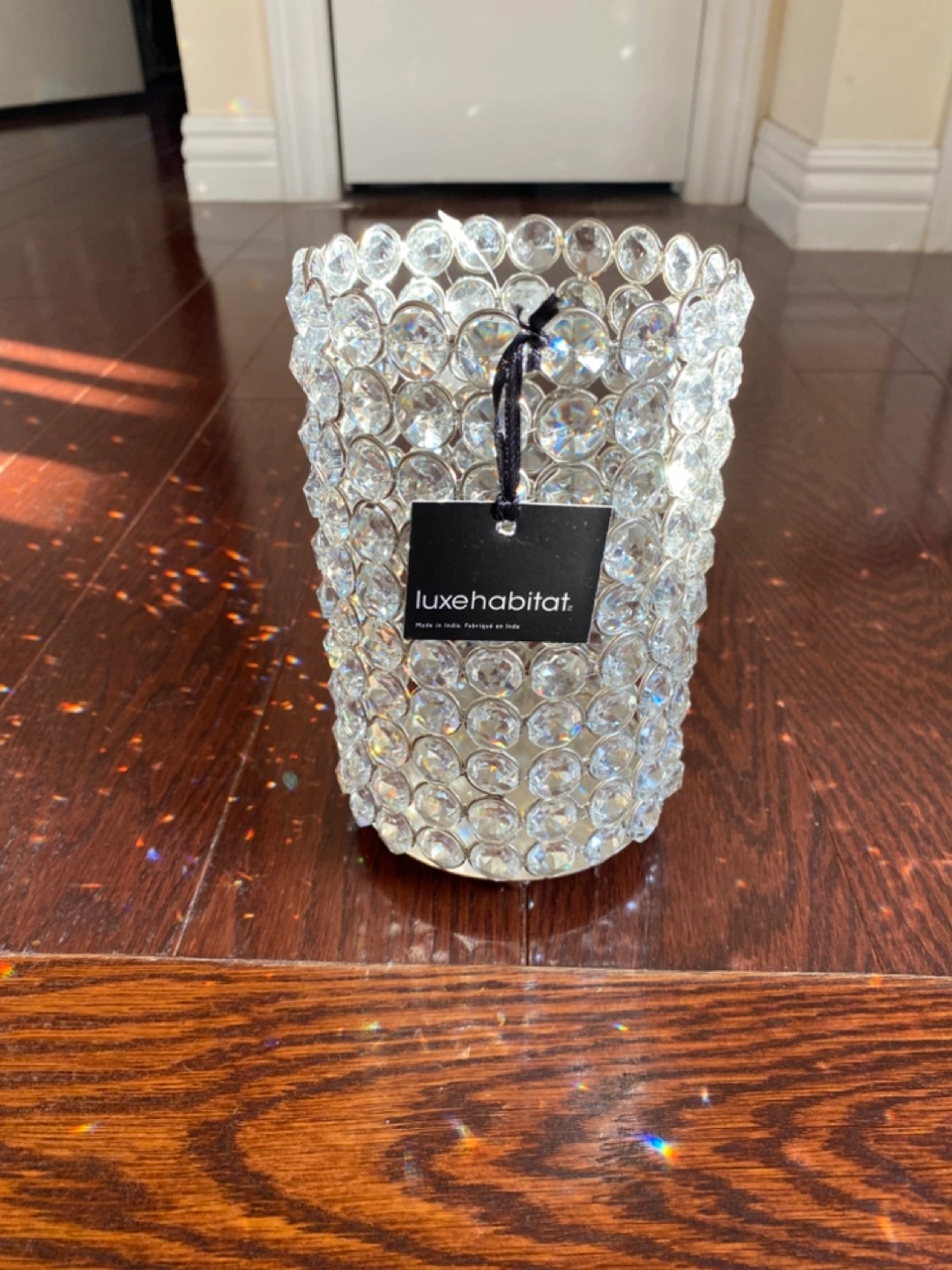 Beautiful crystal candle holder. For use with flameless pillar candles only. Silver metal base. Elegant design. Perfect for home décor. Cash Only