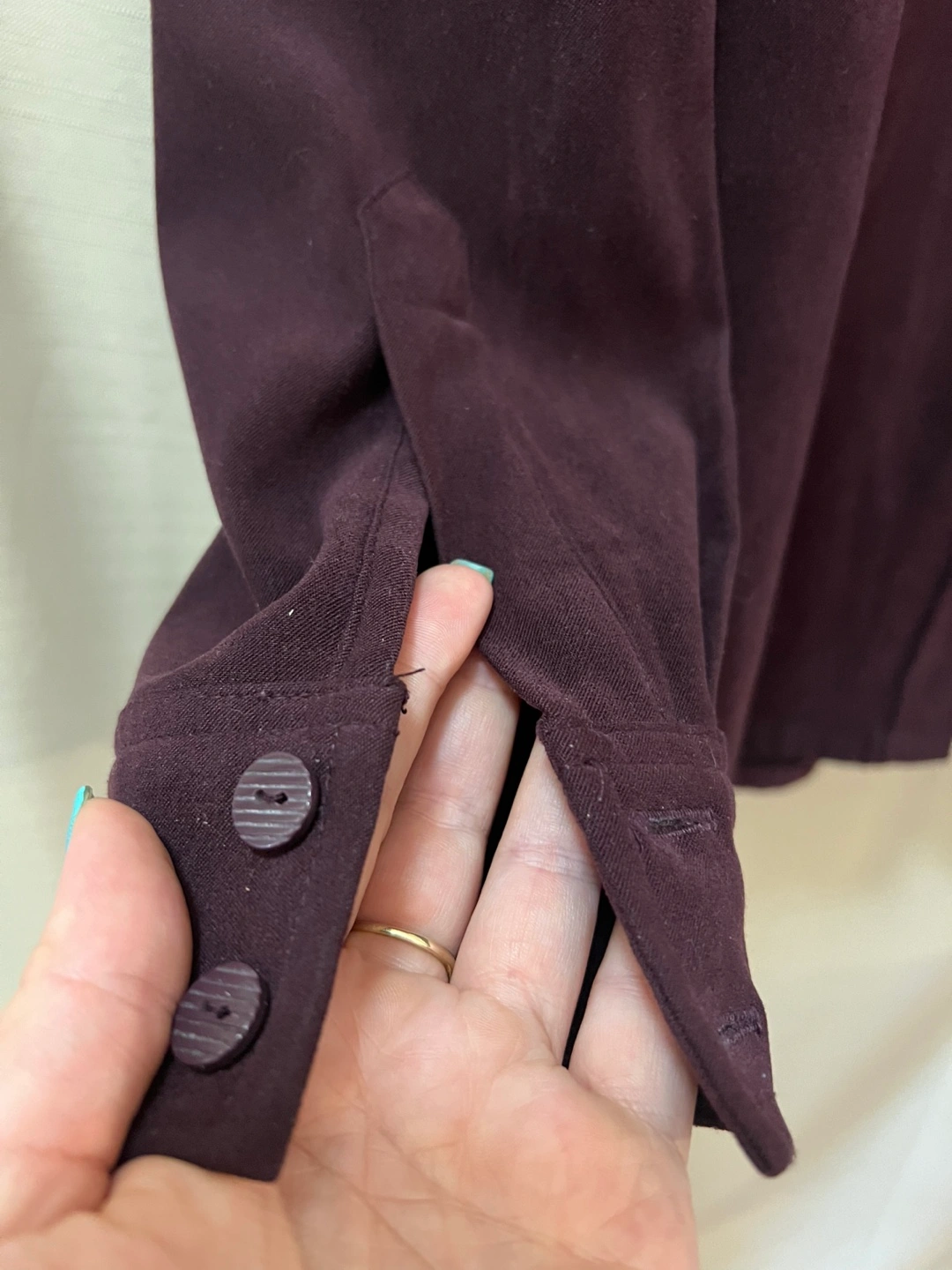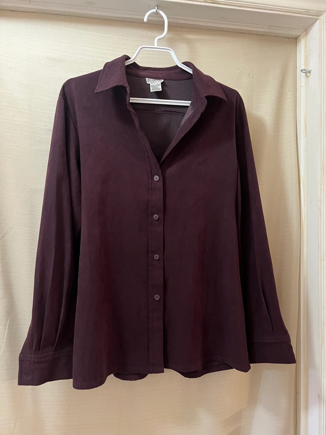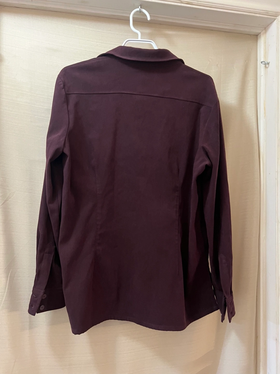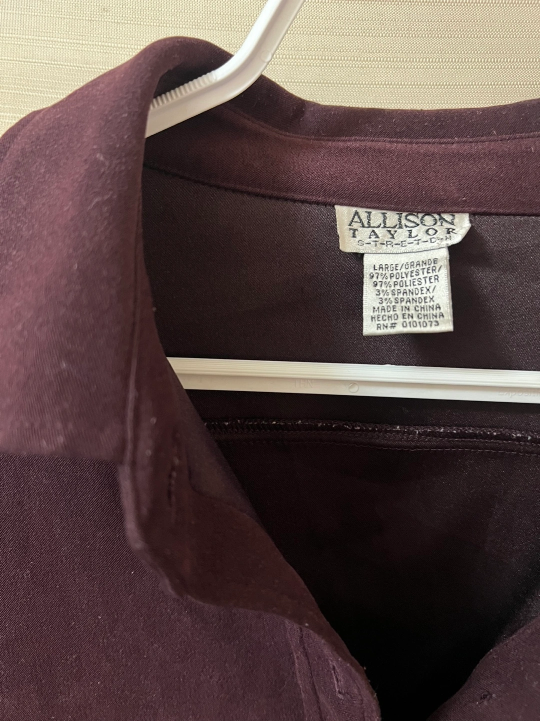 Long-sleeved Allison Taylor dark purple button-down shirt. Size large. 97% polyester, 3% spandex. Ptp- 21 Length- 28 Arm- 24
