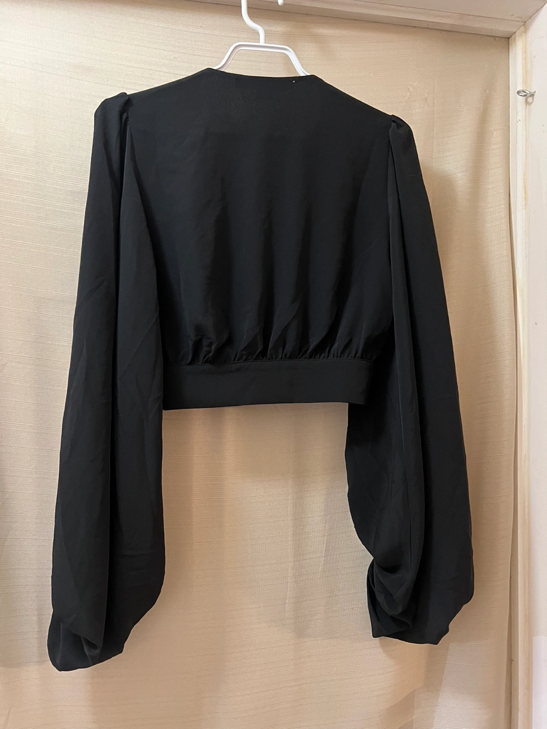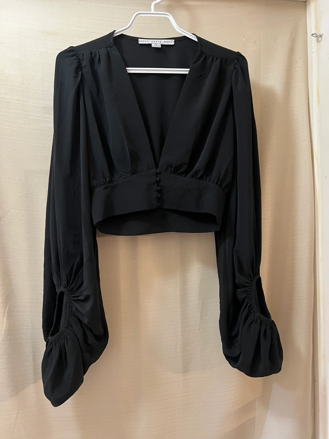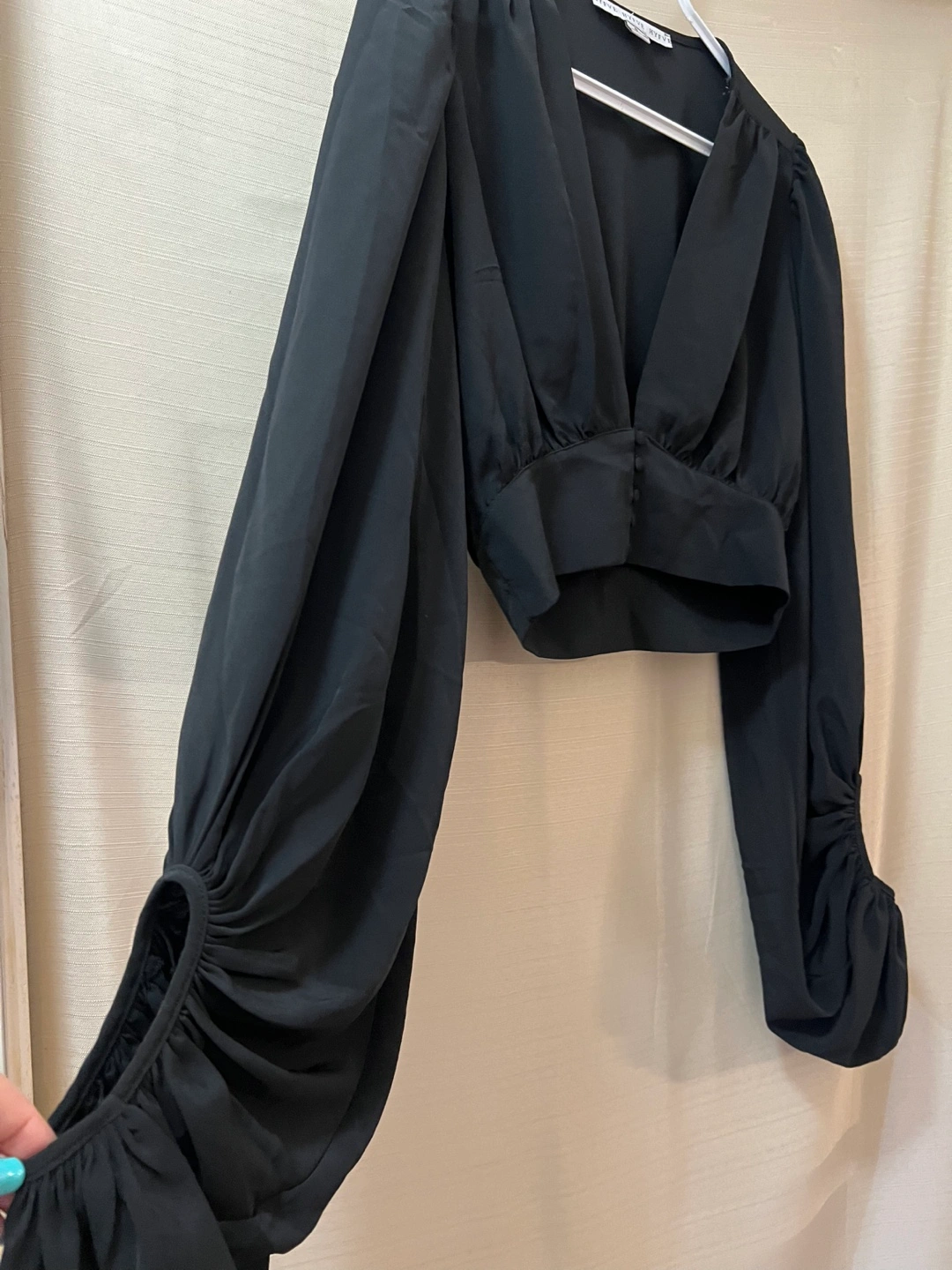 Black cropped long sleeve blouse. Features puff sleeves, button front, and V-neck. Size small. Ptp- 18 Length- 17 Arm- 28 (approx) Waist- 12.5