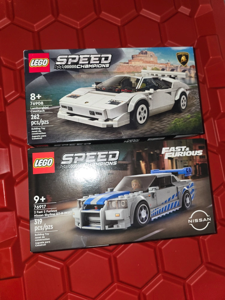 Two LEGO Speed Champions sets. Lamborghini Countach 76908, 262 pieces. Nissan Skyline GT-R 76917, 319 pieces. Both new in box. 50 for both