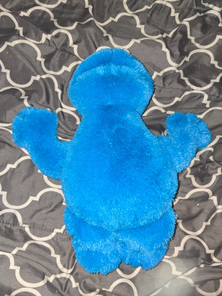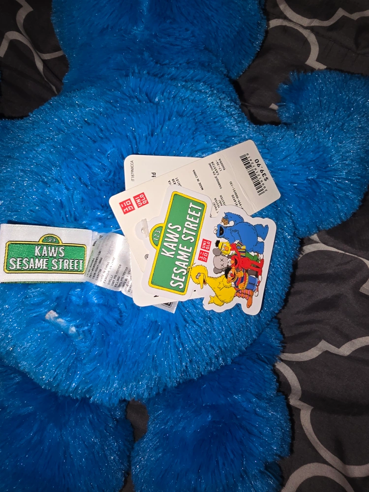 Adorable Cookie Monster plush. Soft blue fur. KAWS x Sesame Street collaboration. UNIQLO tag. Excellent condition.