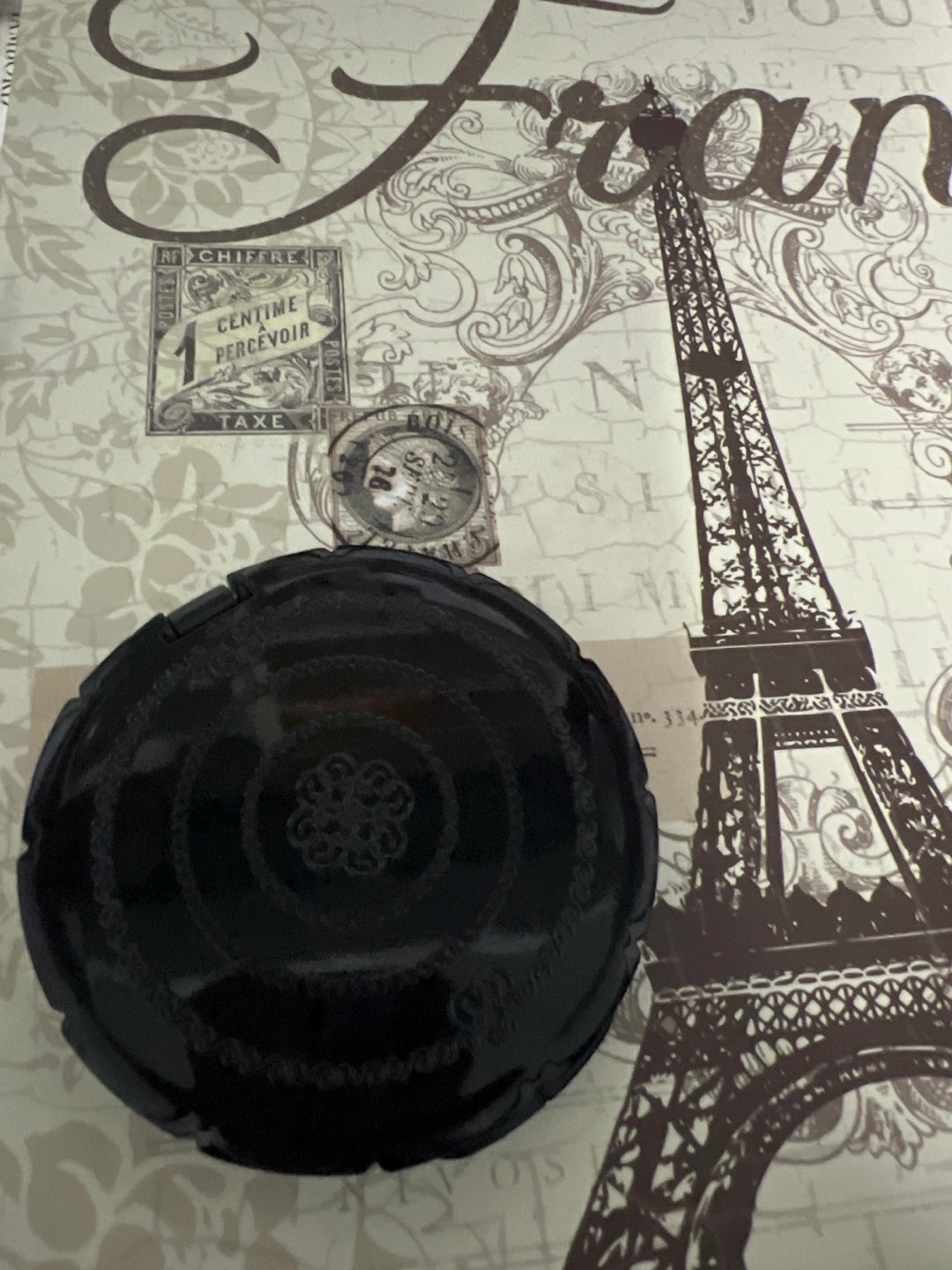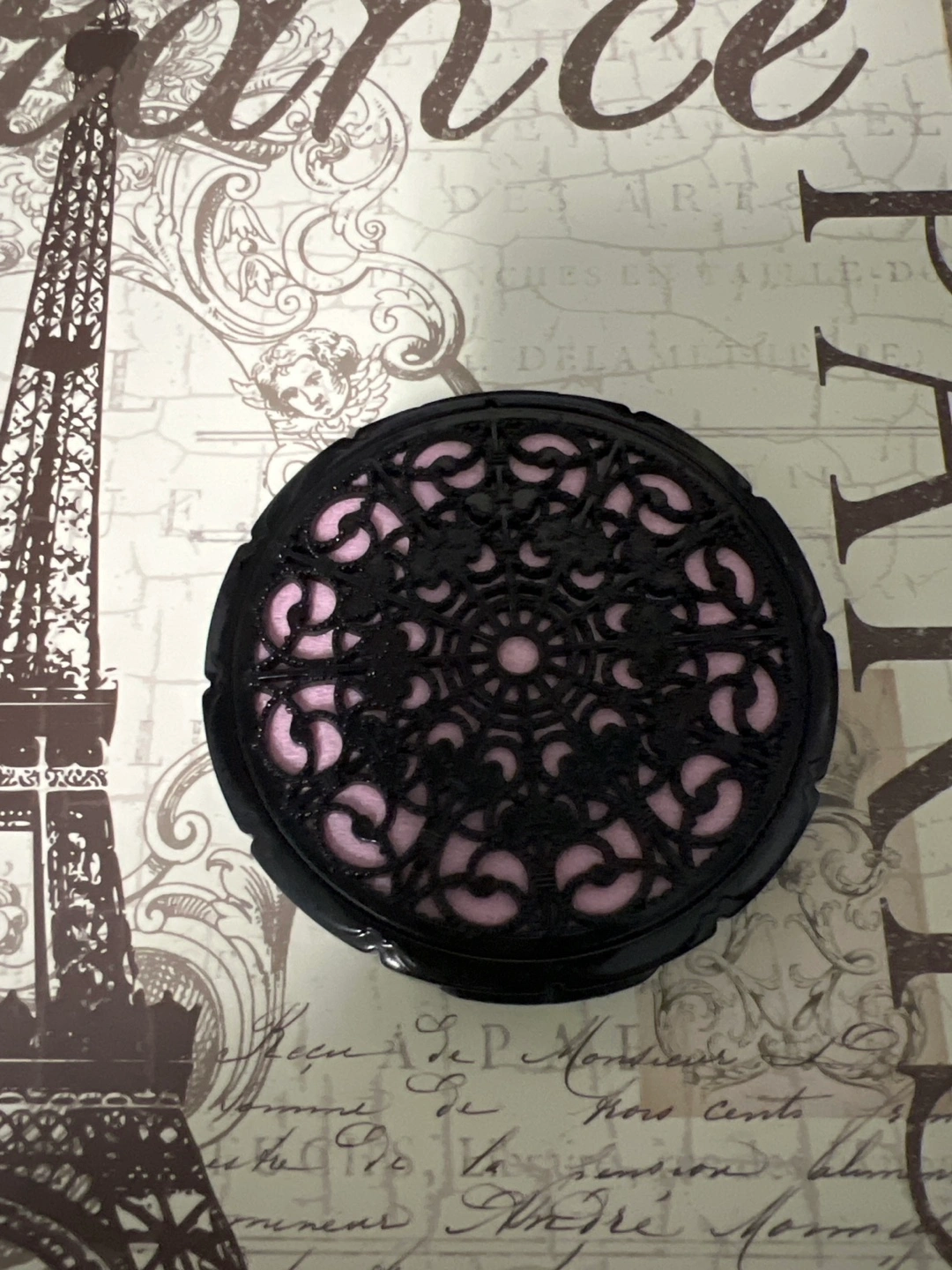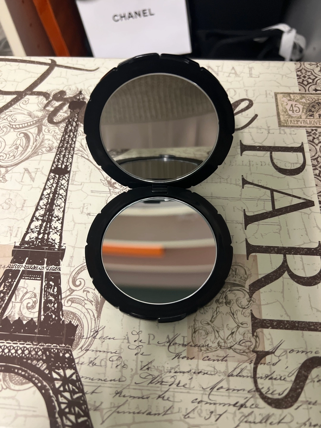 Small round compact mirror with black lace plastic casing with intricate filigree design. Opens to reveal two mirrors; one for close up and the other for full view. Perfect for slipping into your purse and checking on your makeup throughout the day.