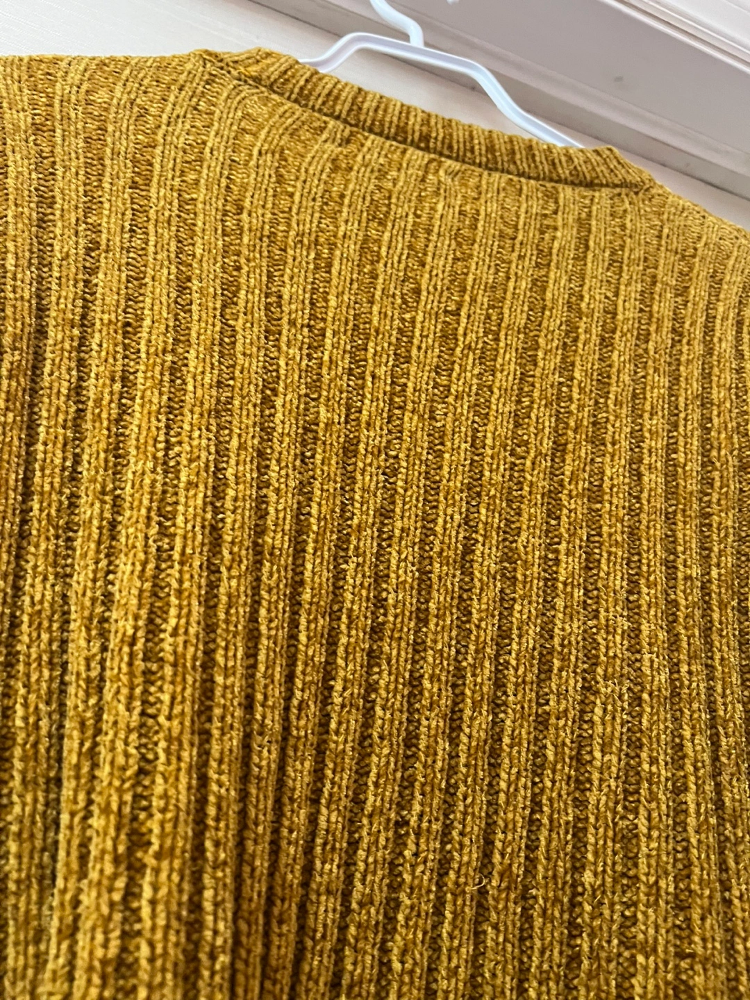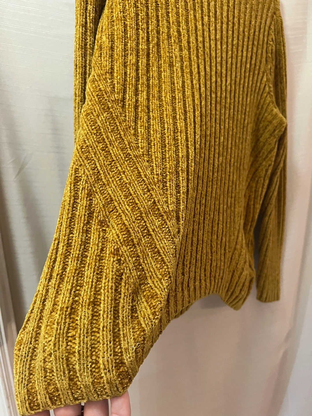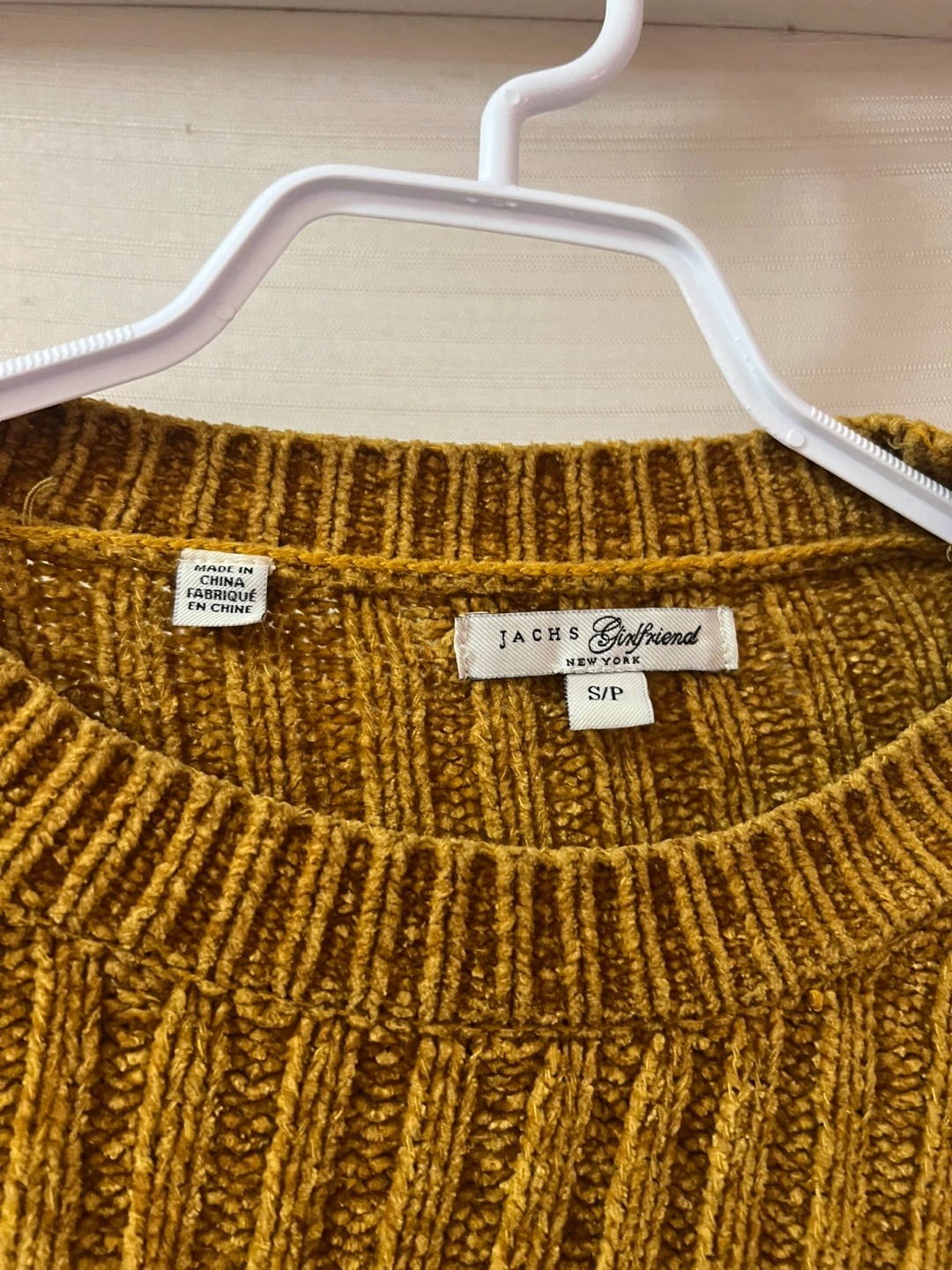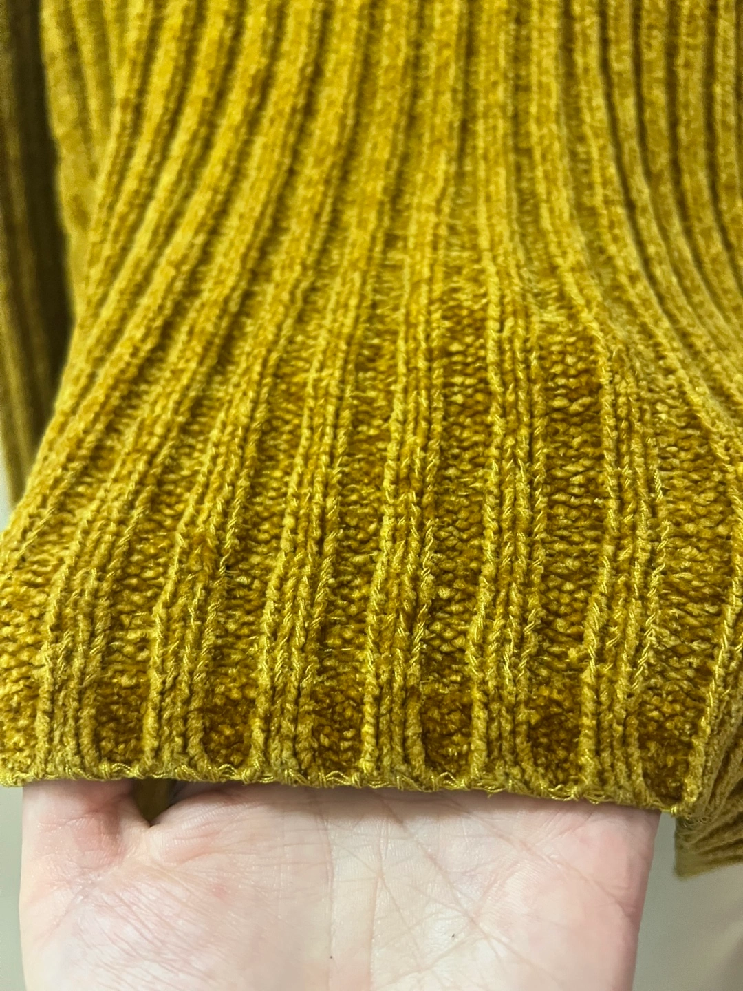 Mustard yellow ribbed knit sweater. Size small. Long sleeves. One spot to notice, as shown in pictures. Ptp- 23 Length- 25 Arm- 24