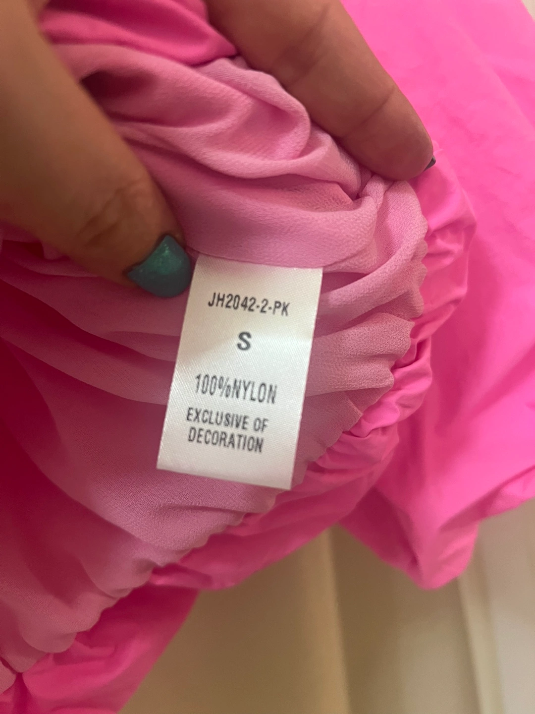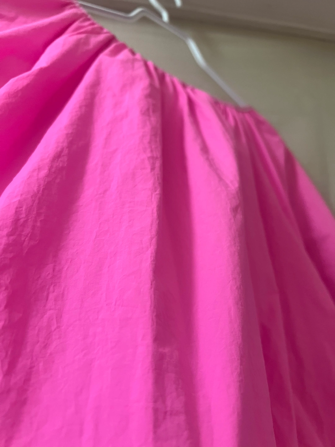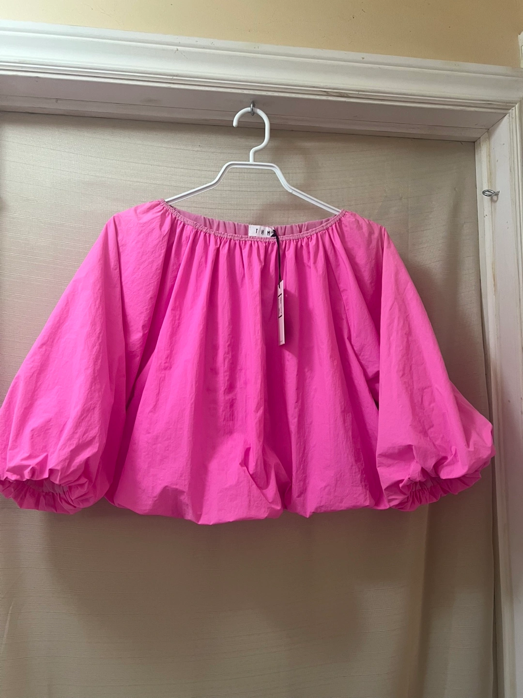 Hot pink cropped blouse. Puff sleeves. Off-the-shoulder neckline. Size small. 100% nylon. Ptp- 22 (approx) Length- 16.5 (approx) Arm- 14 (approx)