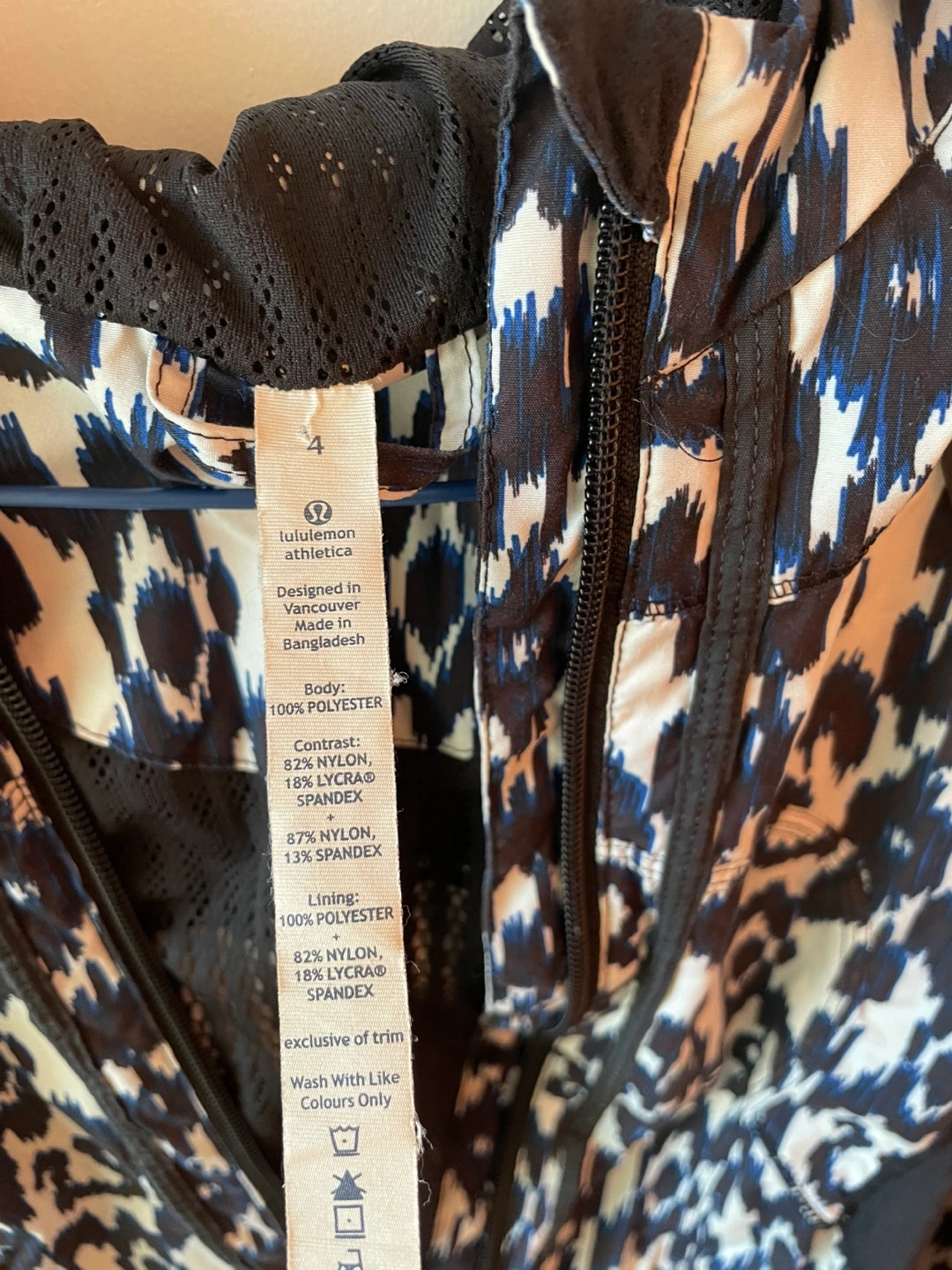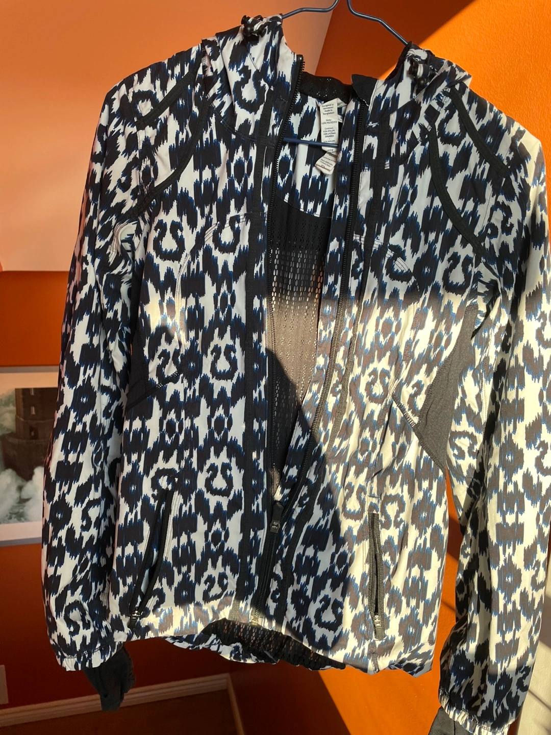 Women's athletic jacket. Lululemon Size 4. Black, white, and blue pattern. Full zip closure. Attached hood. Pockets. Lightweight material. Excellent for layering or running.