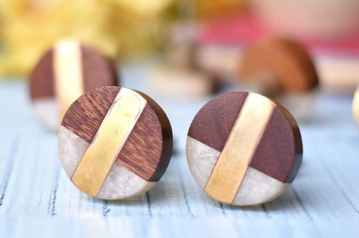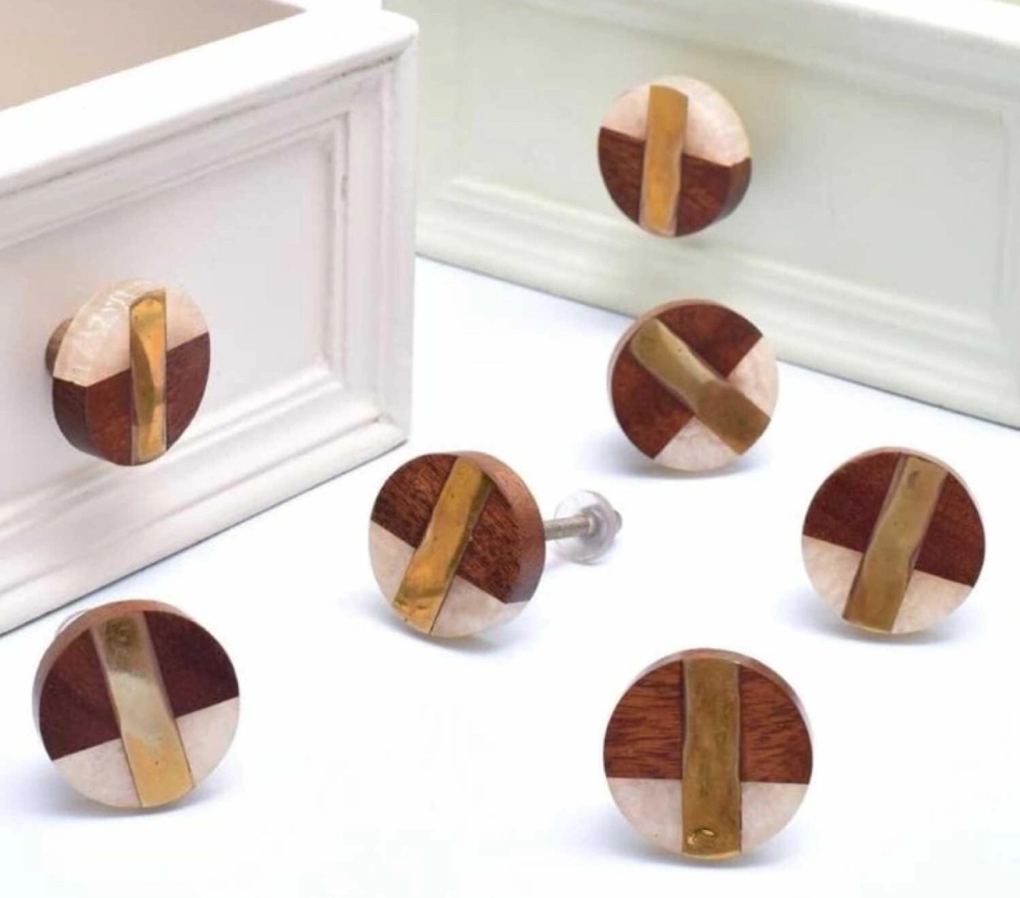Porch pick up may be available. 36 available Round drawer knobs. Dark wood and off-white marble. Brass inlay. Modern design. Perfect for cabinets or drawers. New, never used, metal has a bit of vintage worn look. Measures 1.4 Inches Diameter Approx. 1 Inches Projection Approx. Bolt Size: 1.5 Inches Approx.
