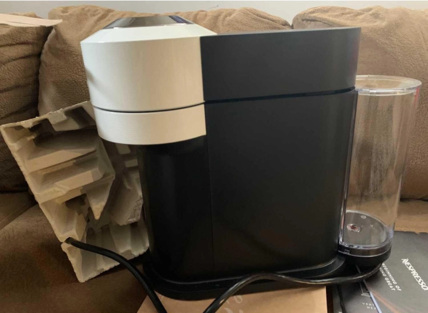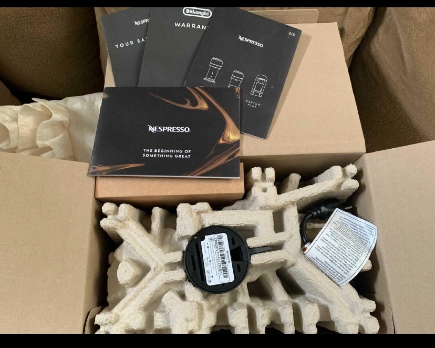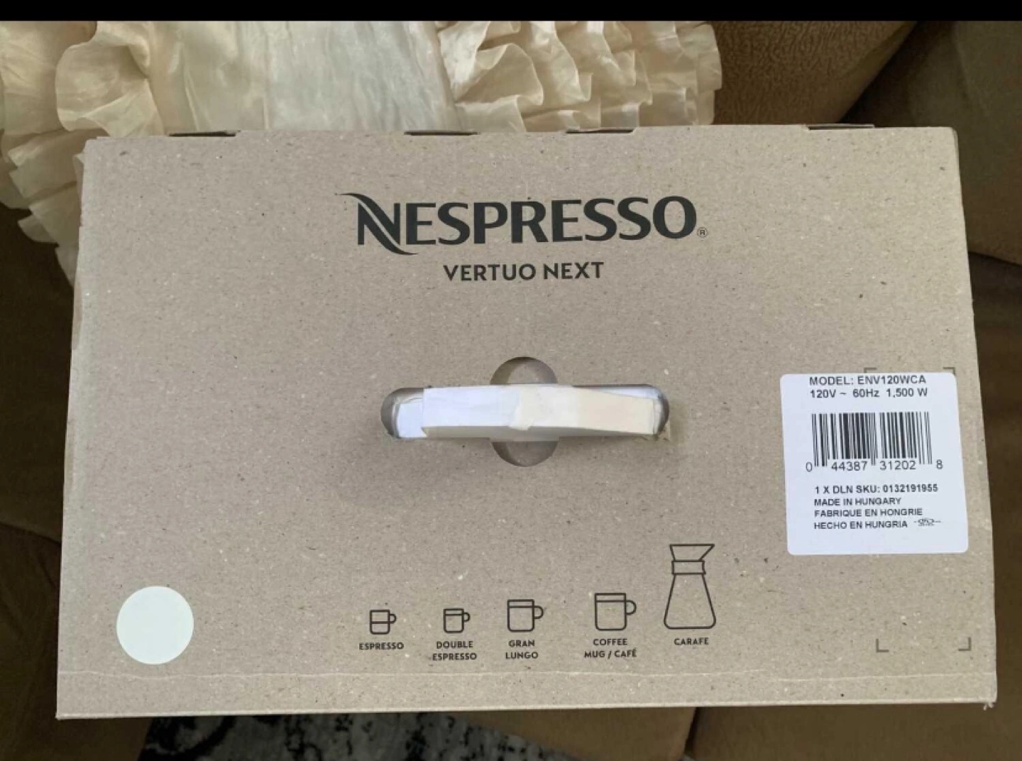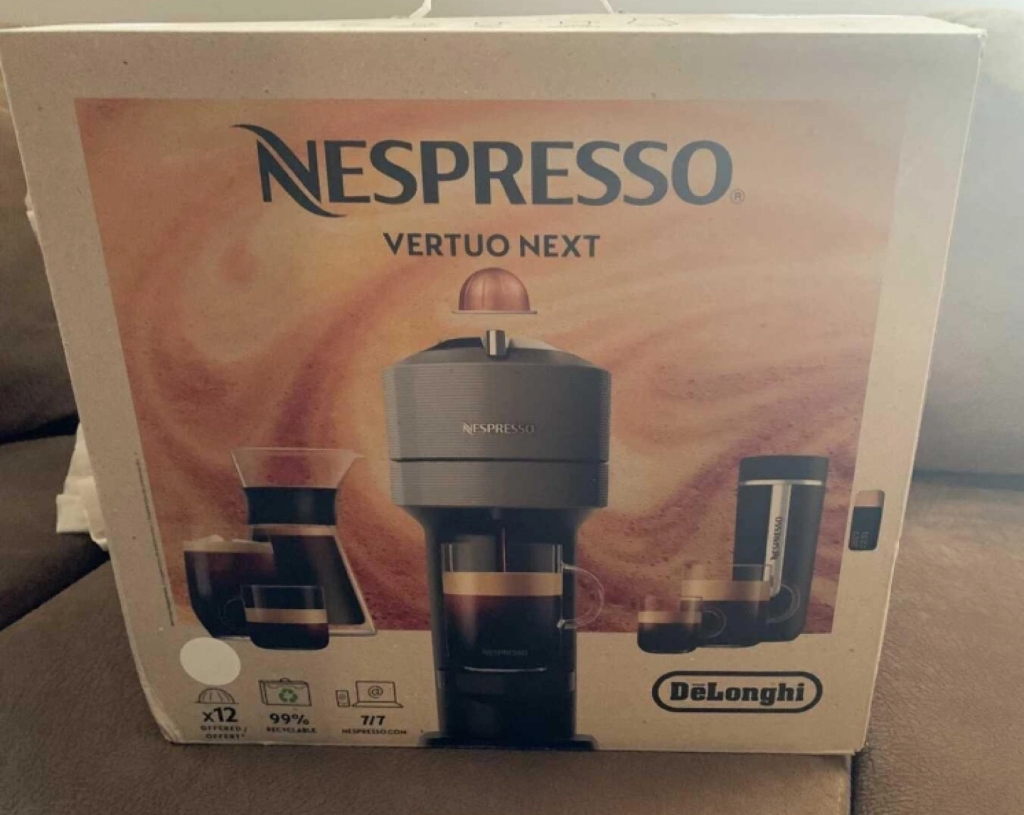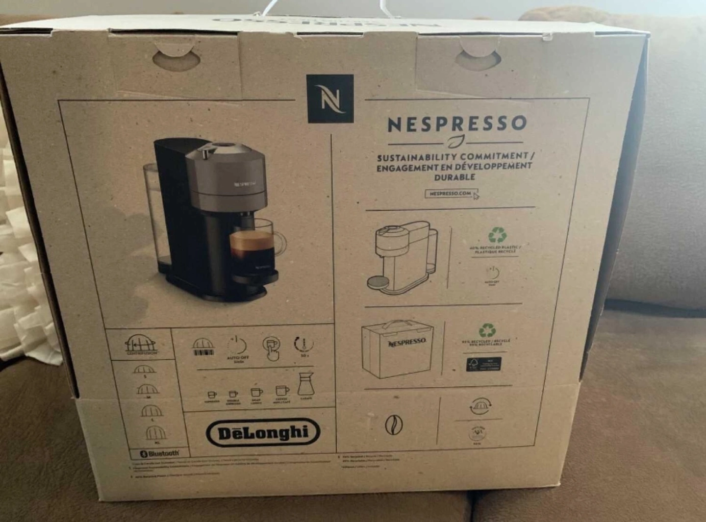 Porch pick up only (Newmarket) - with etransfer New Nespresso Vertuo Next coffee machine by DeLonghi. Includes accessories. Bluetooth enabled. Makes various coffee sizes. New in box, never used. All pieces are present. As pictured: white top 12 coffee caps included, but they are expired.