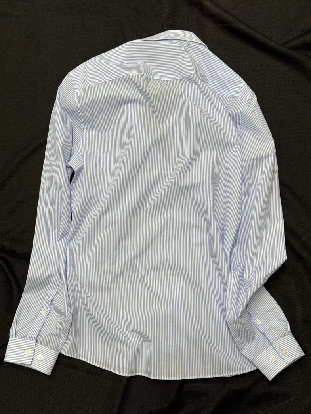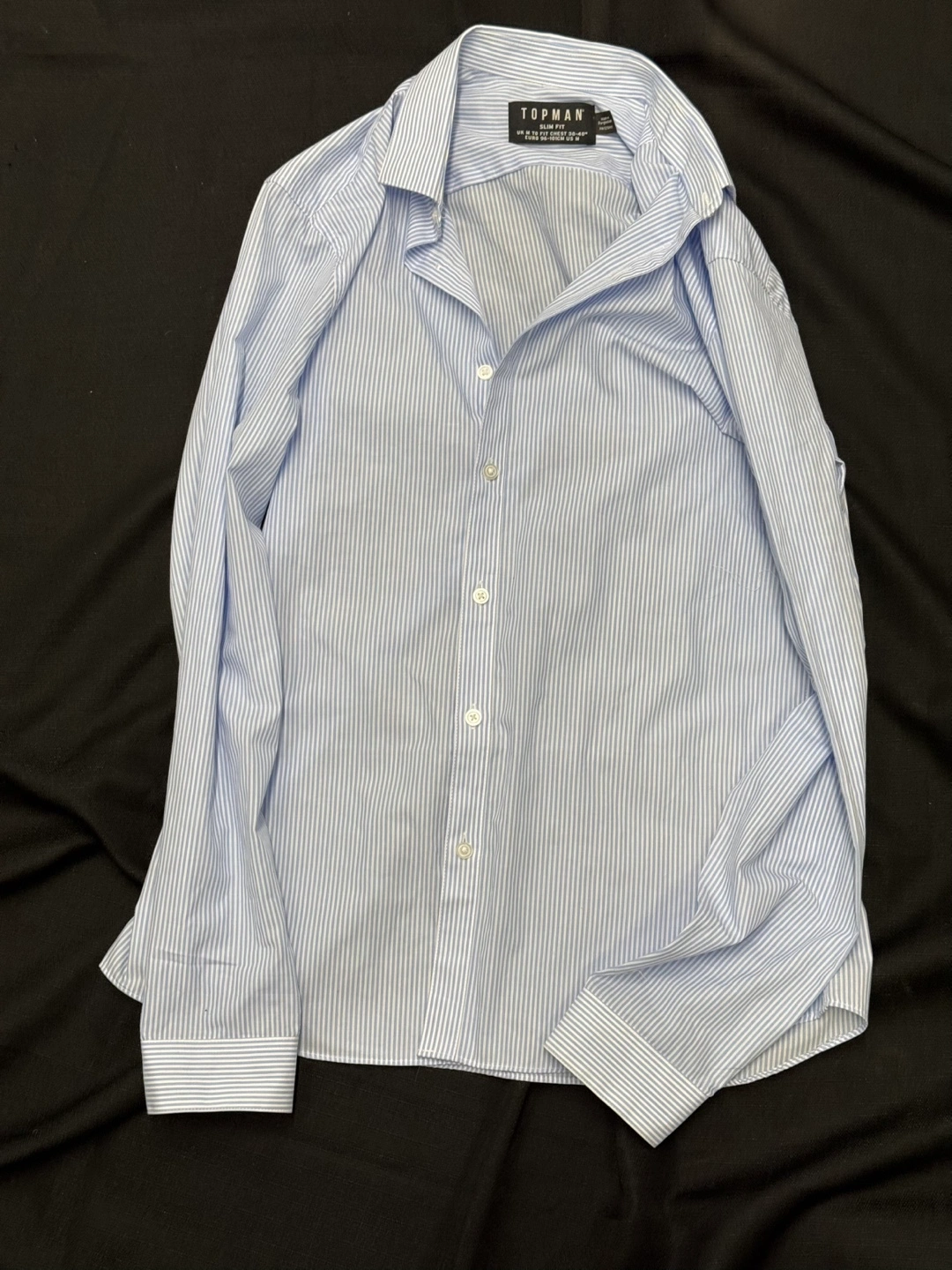 Topshop “top man” slim fit blue striped button up size medium Slim fit white and blue striped button up from top shop. Great condition, hardly worn. Price is firm, cash only please. Pickup downtown Toronto/Jarvis & Gerrard/Yonge & Dundas or we can arrange to meet along TTC line 1.