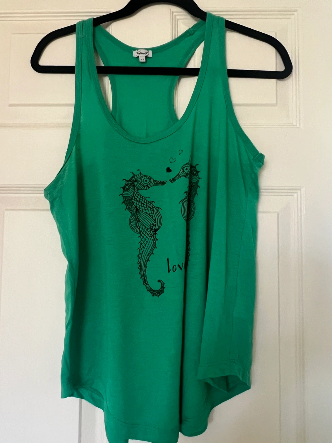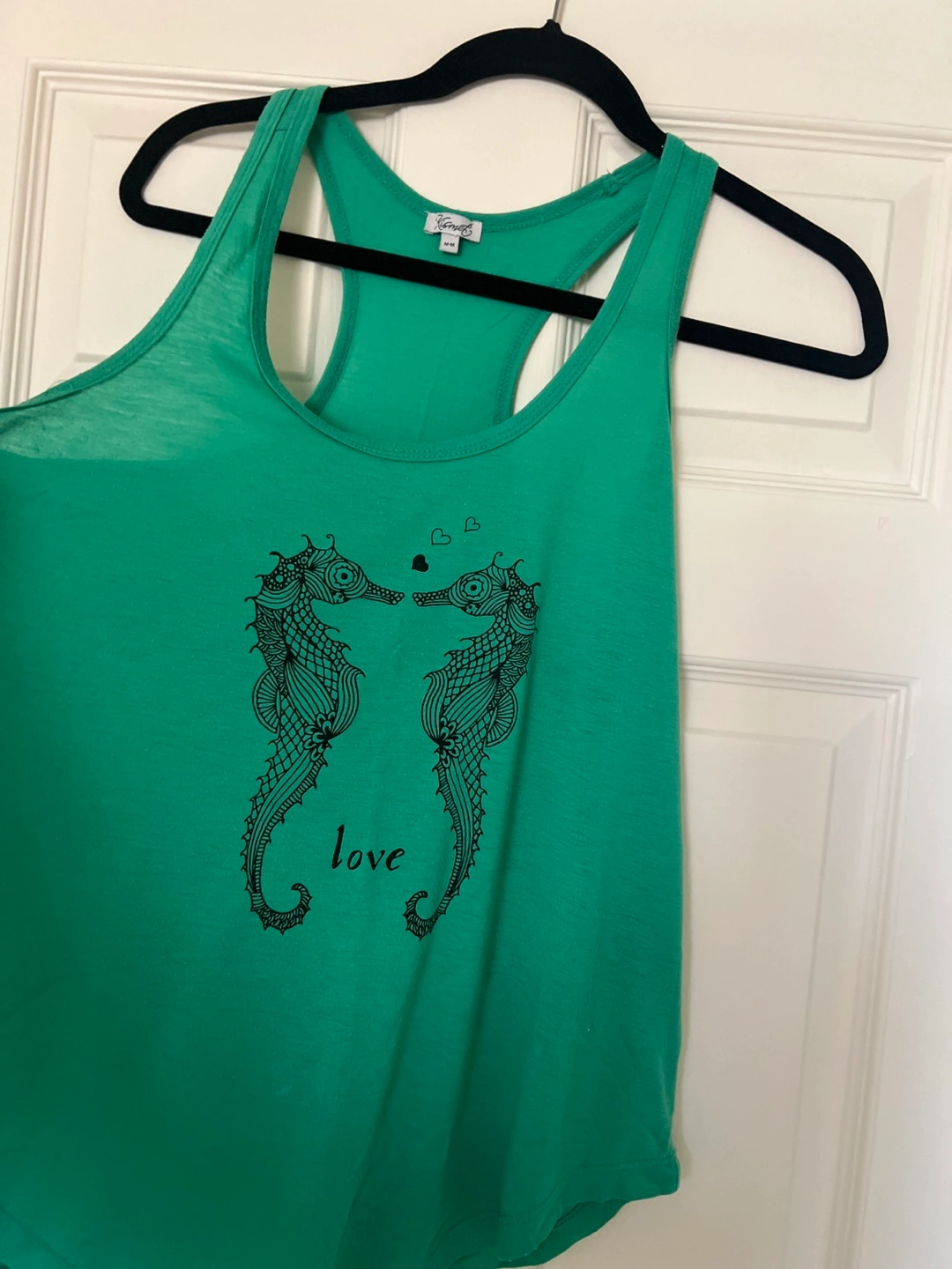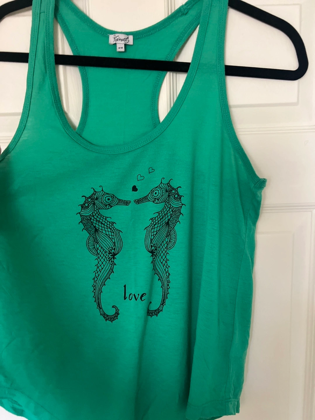 Kismet Cute green tank top. Features a seahorse love design. Size medium. Racer back and curved hem. 65% polyester, 35% rayon. Smoke free home Pick up near Glenanna Road and Hwy 2 If ad is still up it’s available