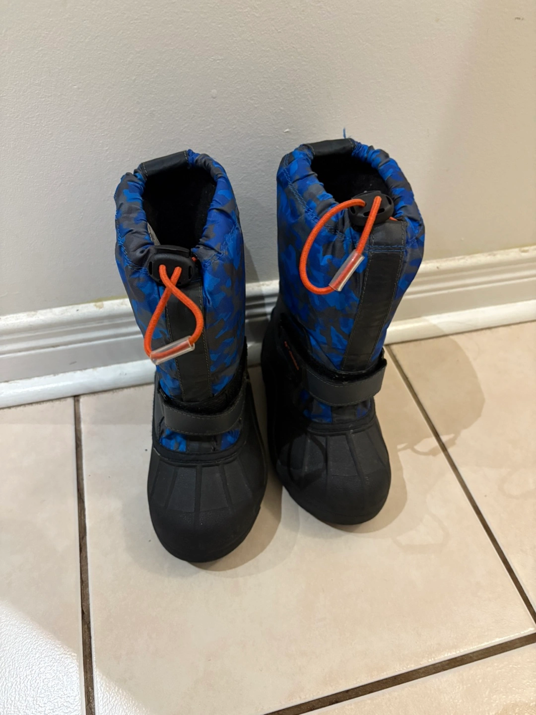 Blue camouflage print. Black rubber sole. Orange drawstring. Velcro closure. Good for winter weather.