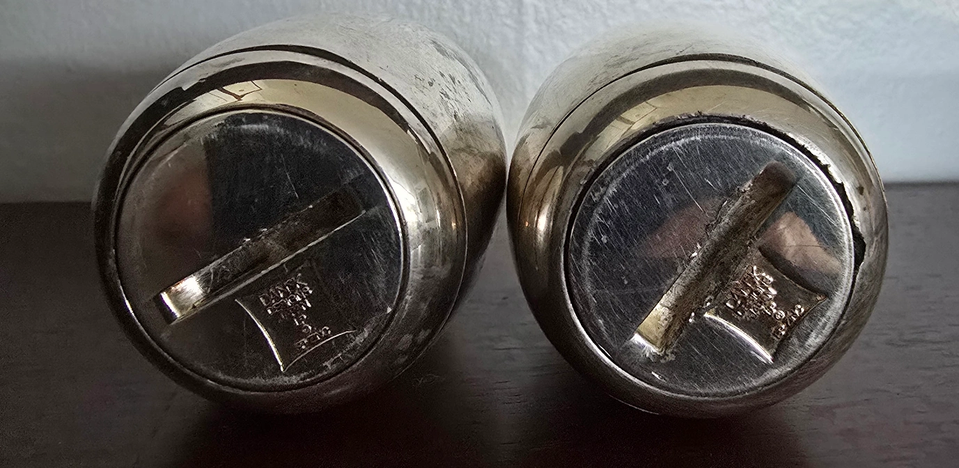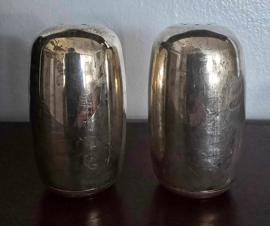 Pair of vintage silver-plated salt and pepper shakers. Smooth, rounded design. Some minor wear consistent with age and use. Unique and stylish addition to any table setting.