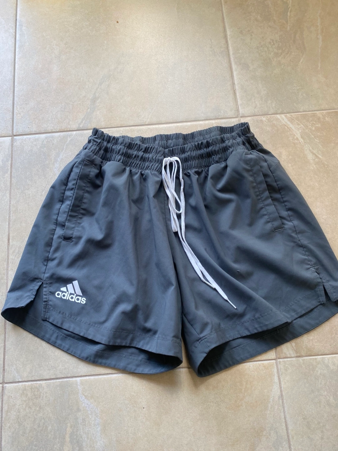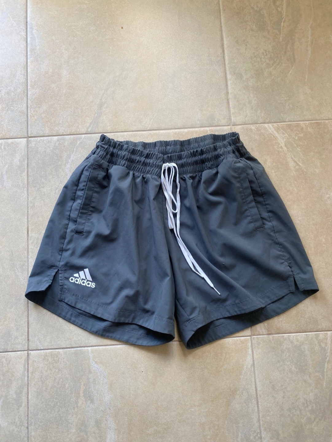 Women's Adidas running shorts. Dark grey colour. Elastic waistband with drawstring. Side pockets. Excellent for workouts or casual wear.