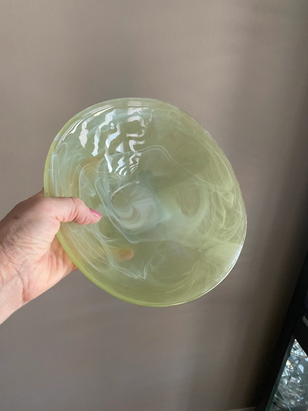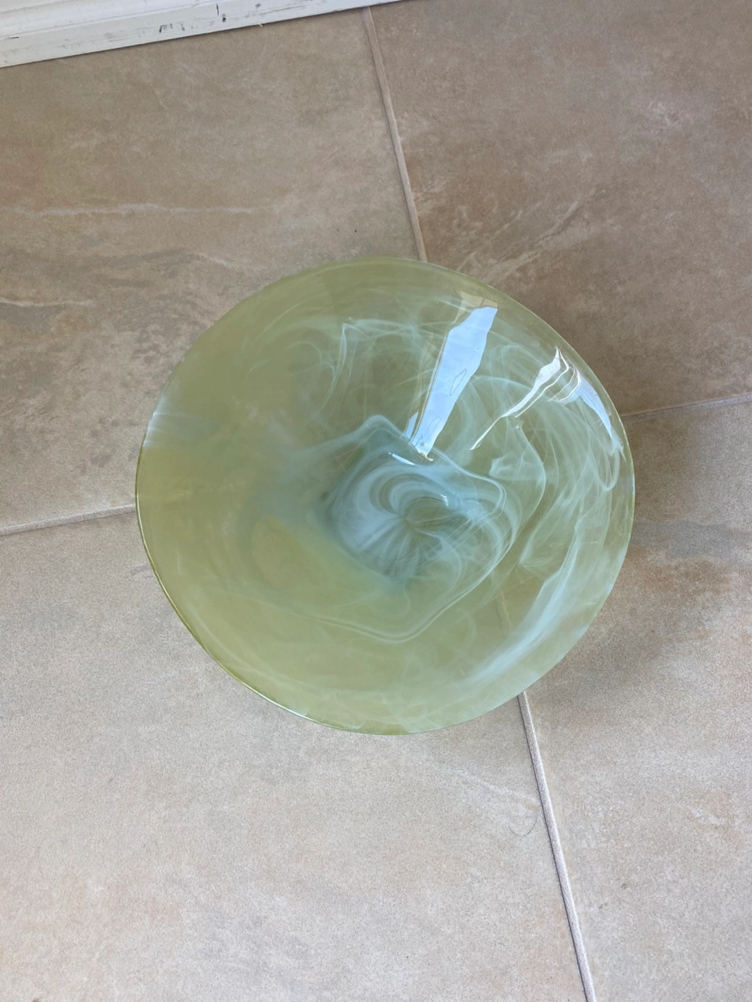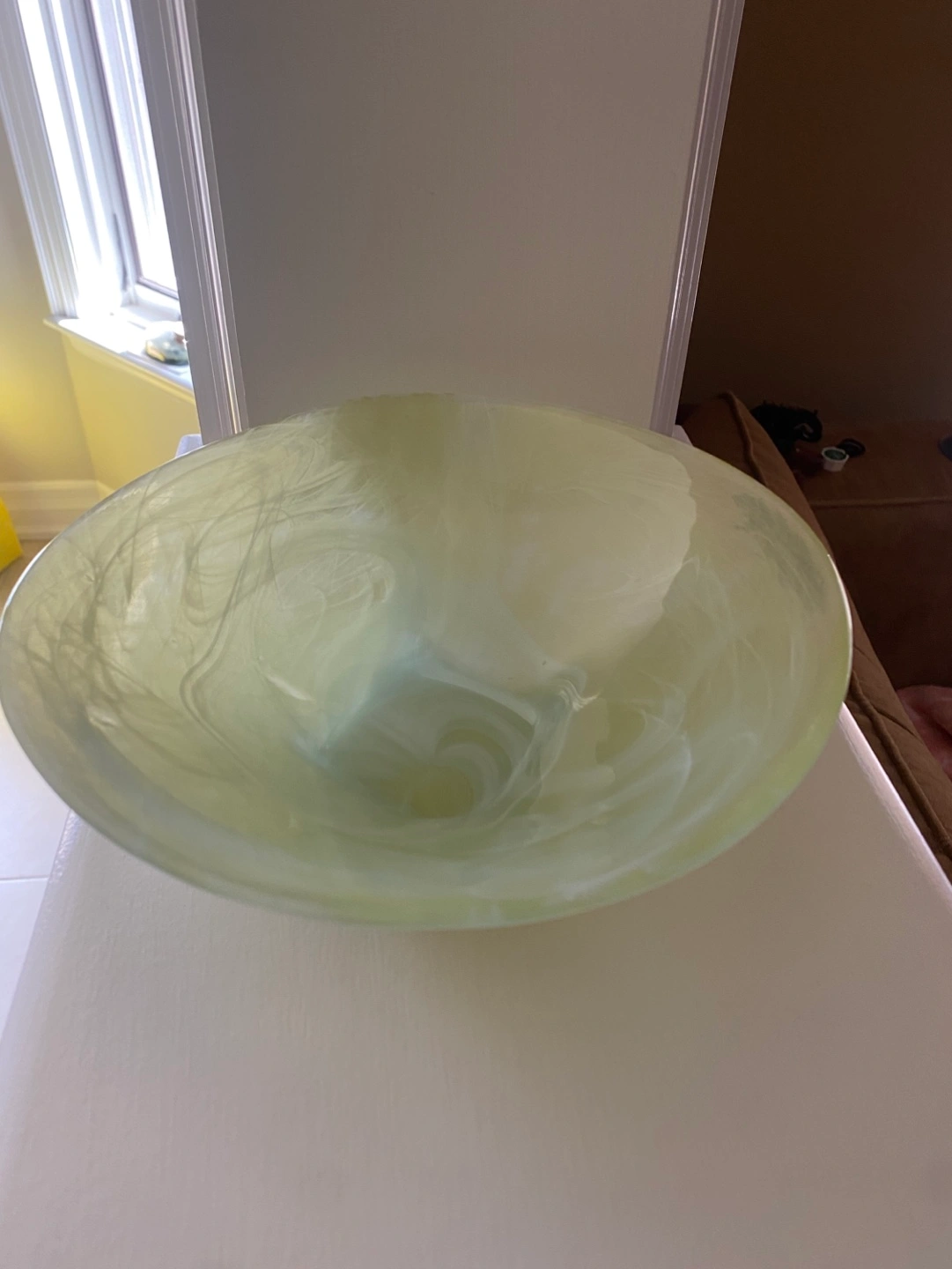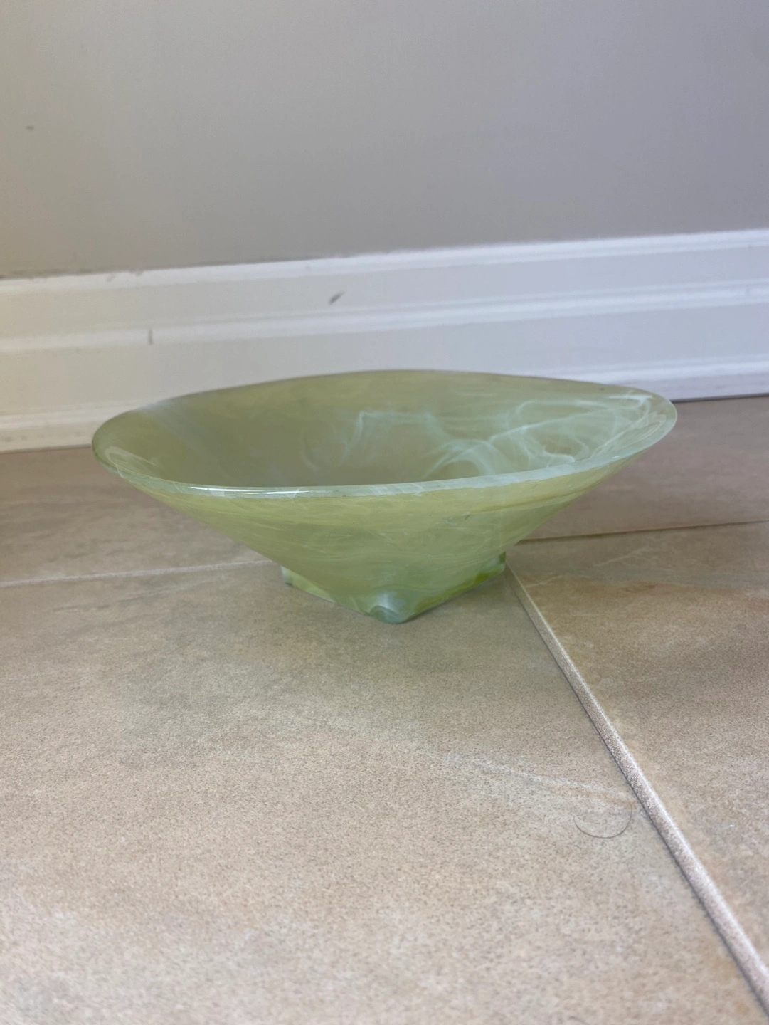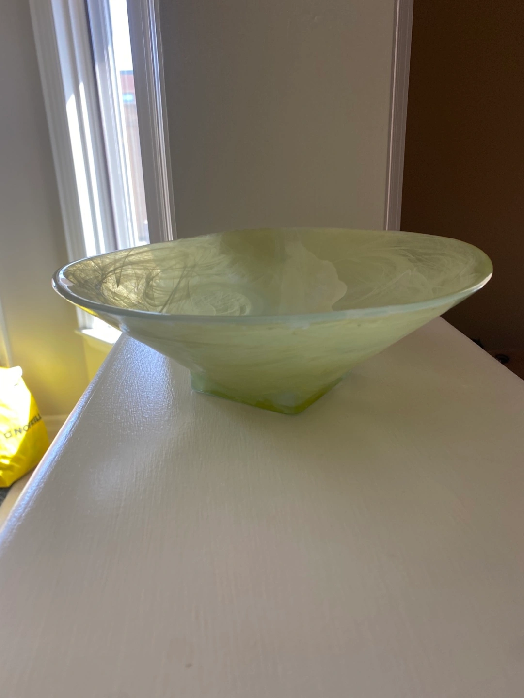 Unique swirling design. Wide, shallow bowl. Square base. Perfect for fruit, keys, or decorative use. 9 inches in diameter