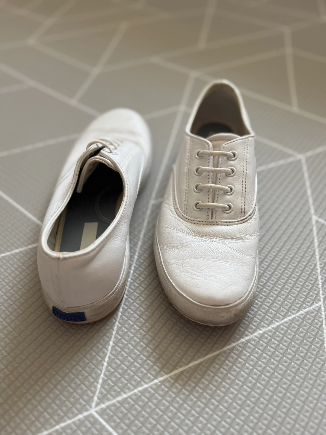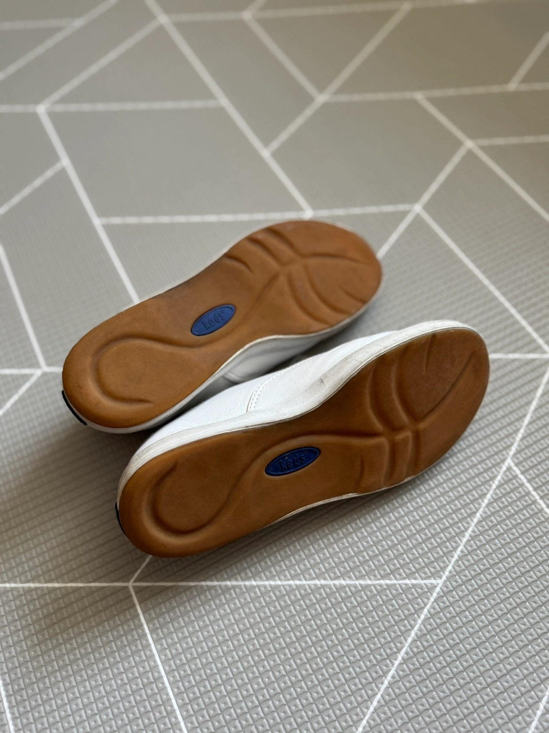 Pair of women's white leather Keds sneakers. Lace-up closure. Minimal wear. Great casual shoes.