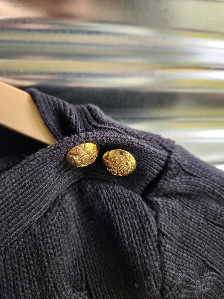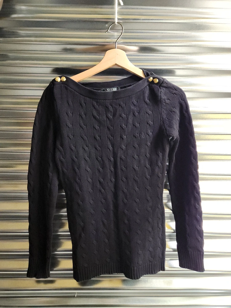 Women's black cable knit sweater. Size small. Features gold buttons on the shoulders. Long sleeves. Boat neck. 100% cotton.
