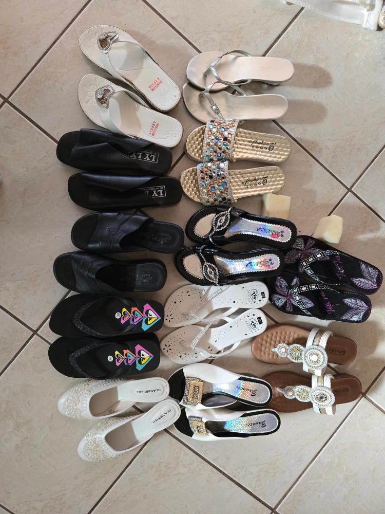 Large collection of women's footwear. Includes various styles of sandals, flip-flops, and wedges. Many different colours and embellishments. Size 5 some are brand new and some are lightly used