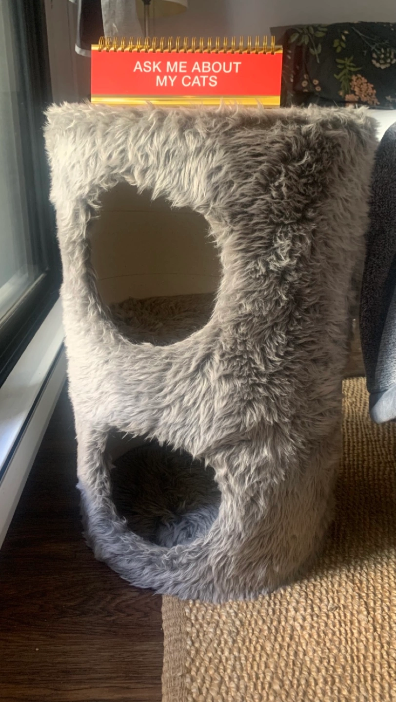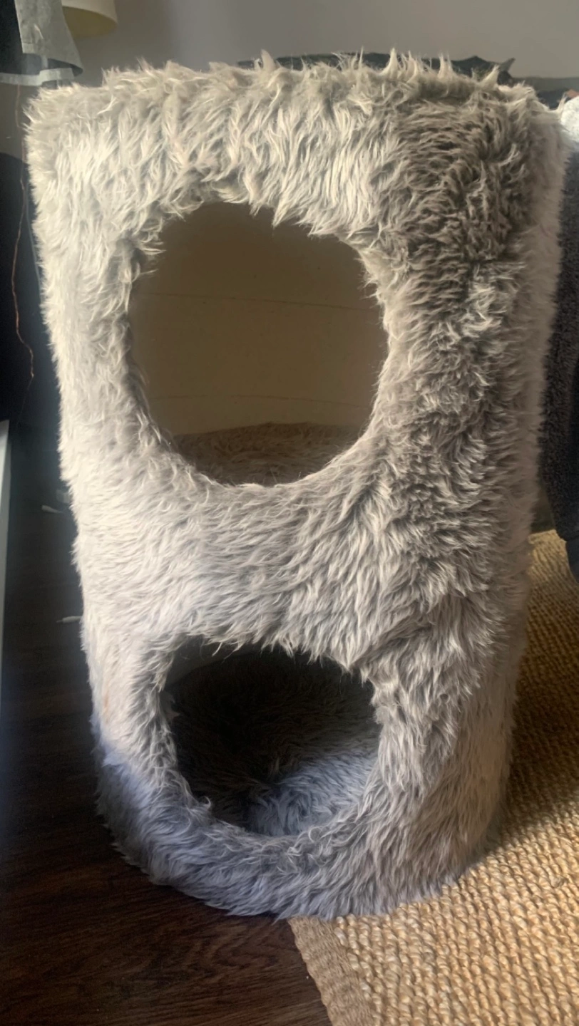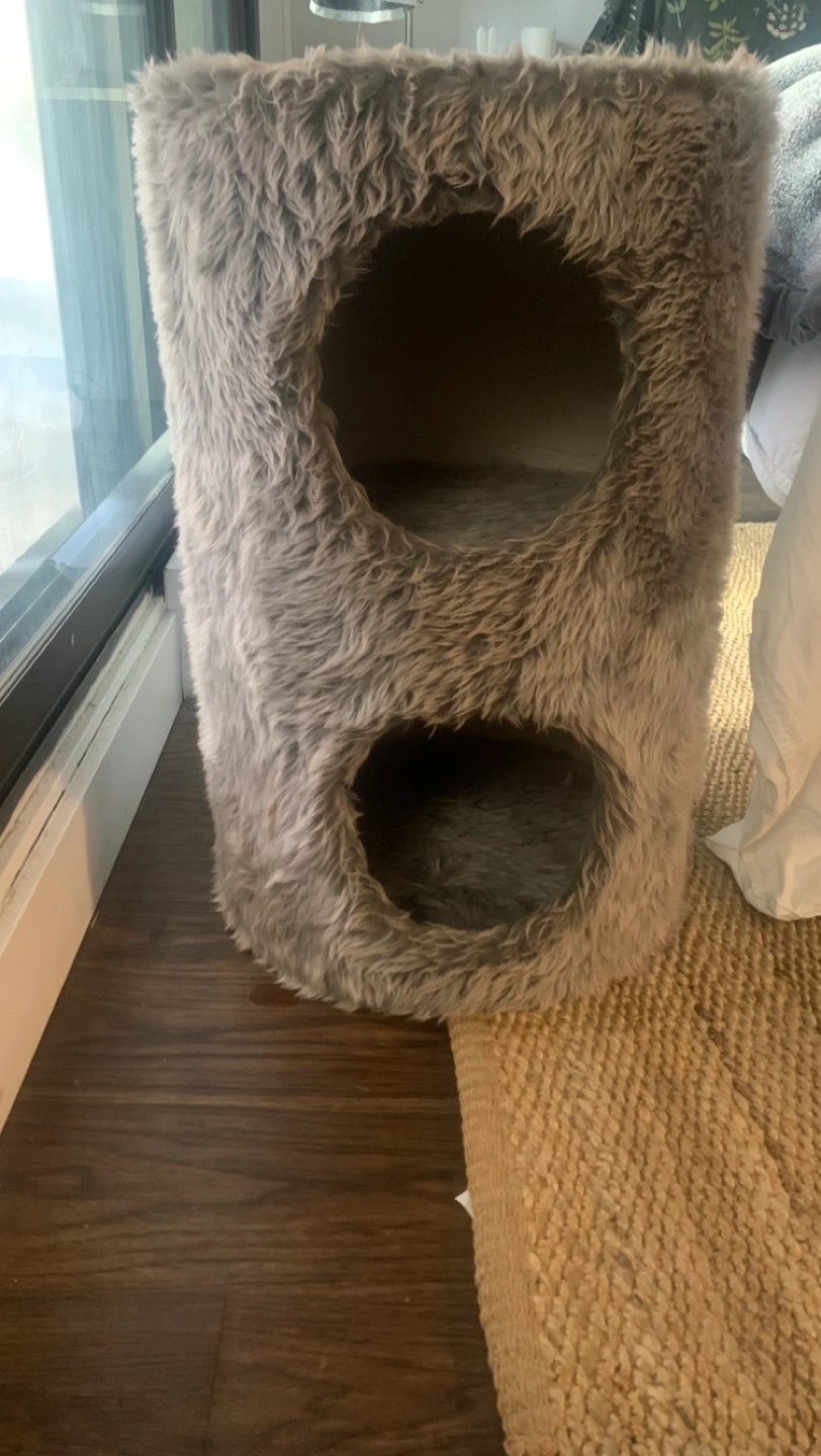 Cozy cat condo, two levels, about 22” tall. Soft grey fur exterior. Price is non-negotiable, cash preferred! Perfect for lounging and playing. Almost new condition as I only bought it while I was cat sitting for a friend for 2 months! Great for shy cats who enjoy quiet peaceful time in dark, elevated hidey spaces.