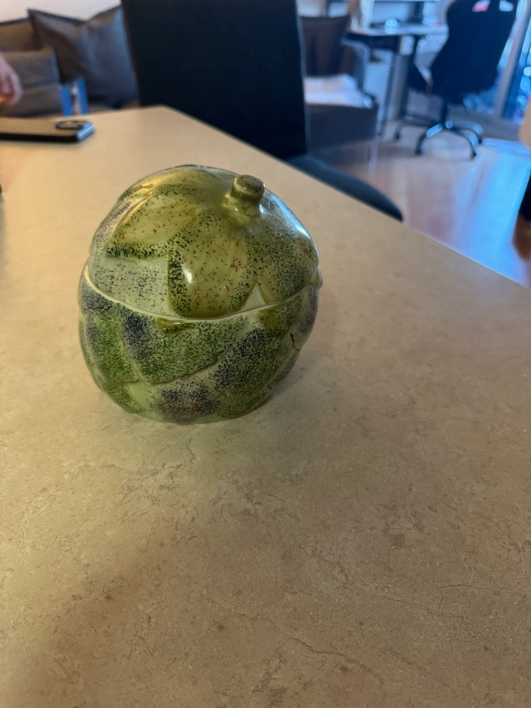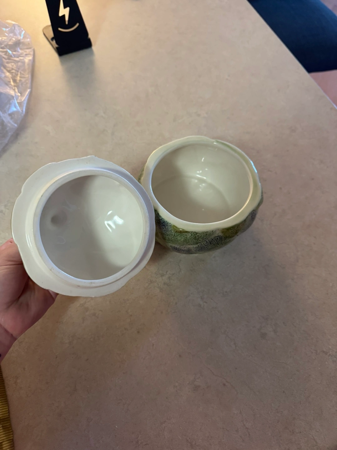 Cute ceramic jar. Green and purple colors. Perfect for storing cookies or other treats. Lid included. Cash only Pickup 60 Heintzman st