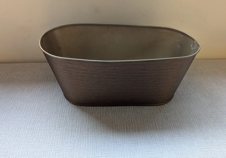 Dark brown metal planter. Oval shape. Good for indoor or outdoor use. Perfect for small plants or flowers.