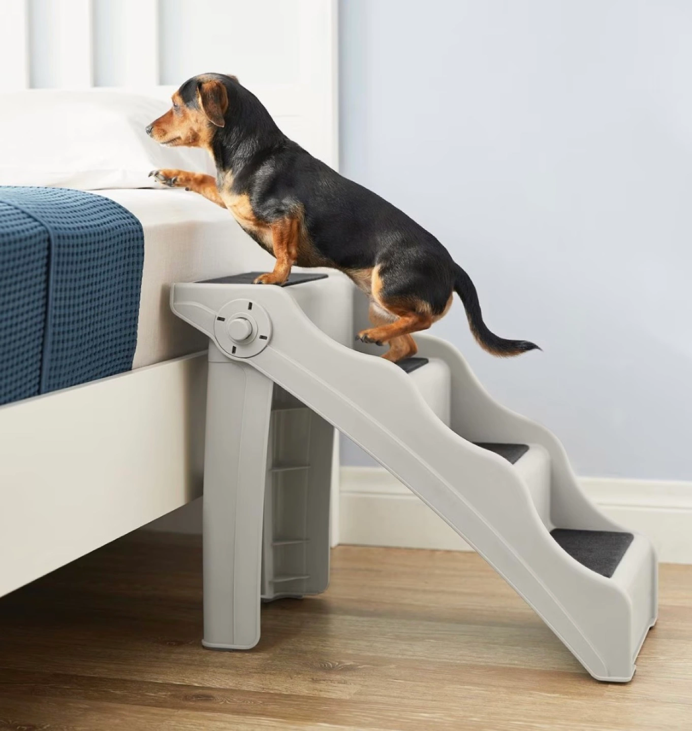 Beige and black pet steps. Three steps. Easy for small dogs and cats to access higher surfaces. Durable plastic construction. Compact design. Excellent condition. Folds easily for storage You can pick up by Carlton and Jarvis area