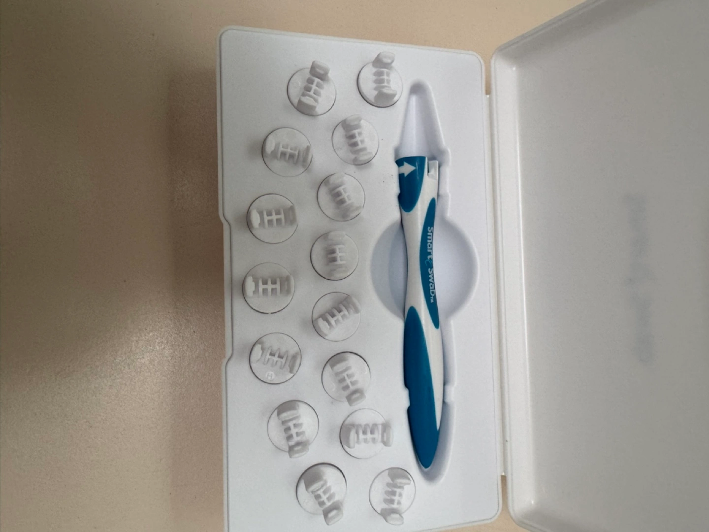 New, unopened SmartSwab ear cleaning kit. Includes twelve individual ear swabs and a cleaning tool. Convenient travel case. Mix and match three or more items on my page for a great deal. Free items not included