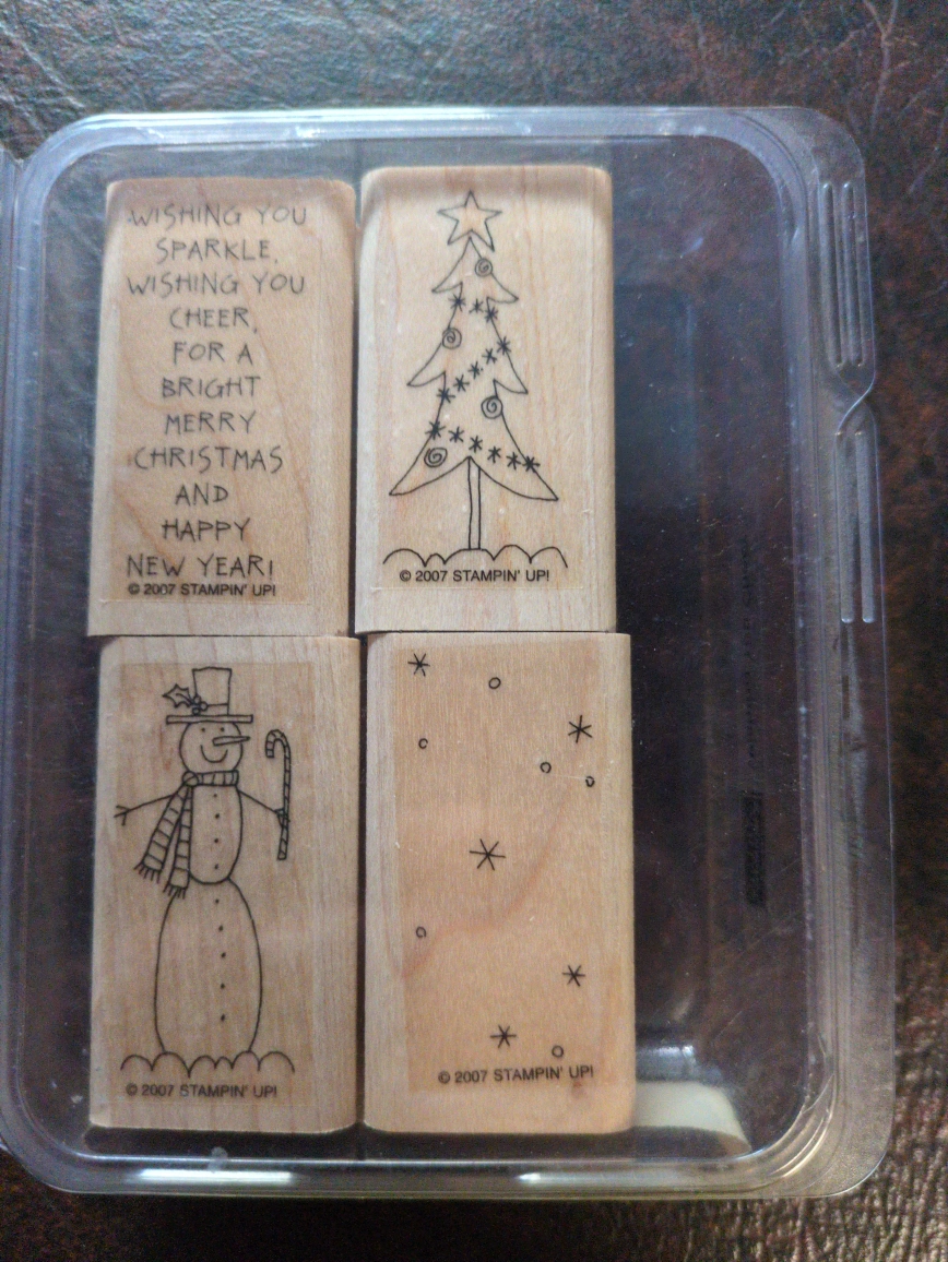 Four wood-mounted rubber stamps. Features a Christmas tree, snowman, and holiday greetings. Perfect for handmade cards and scrapbooking.