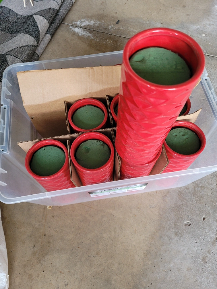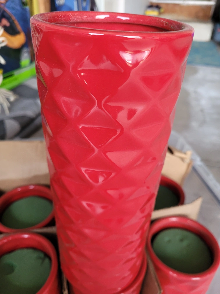 Ten red ceramic vases, diamond pattern, floral foam inserts. Great for weddings or events. Sold as a lot. 12 total