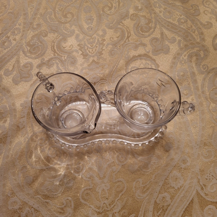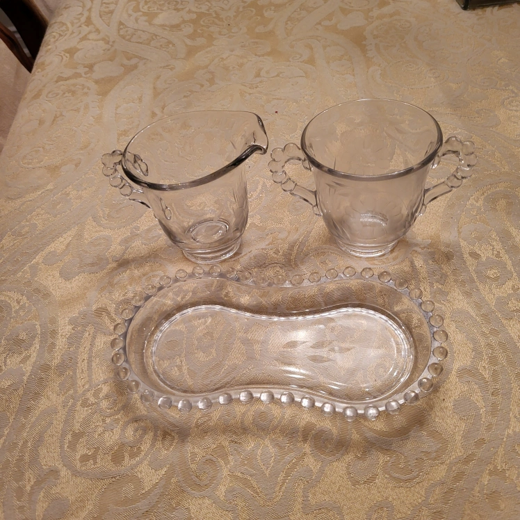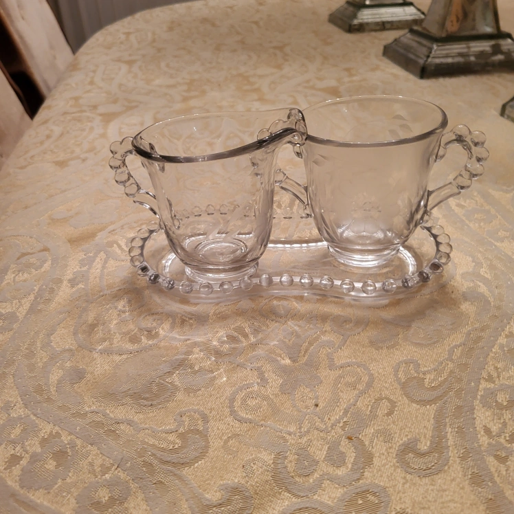 1940's Vintage Candlewick Glass Creamer and Sugar with Matching Tray Features beaded detailing. Elegant and vintage. No Chips or Breaks Was my Grandmother's. Smoke free home Rossland and Stevenson north