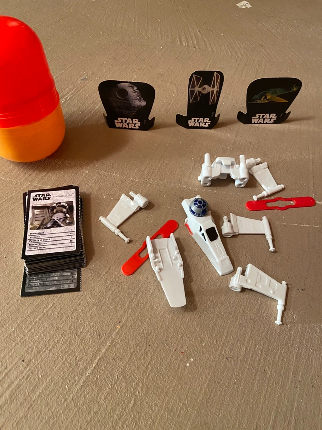 Assemble your own X-Wing starfighter. Includes multiple parts, collectible cards with stats, and three display stands. Orange capsule also included.