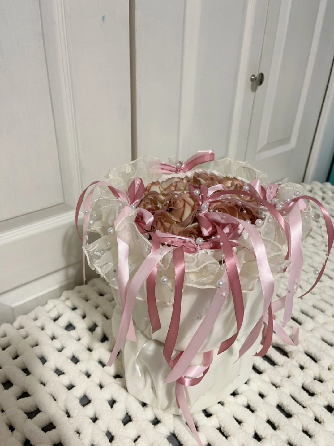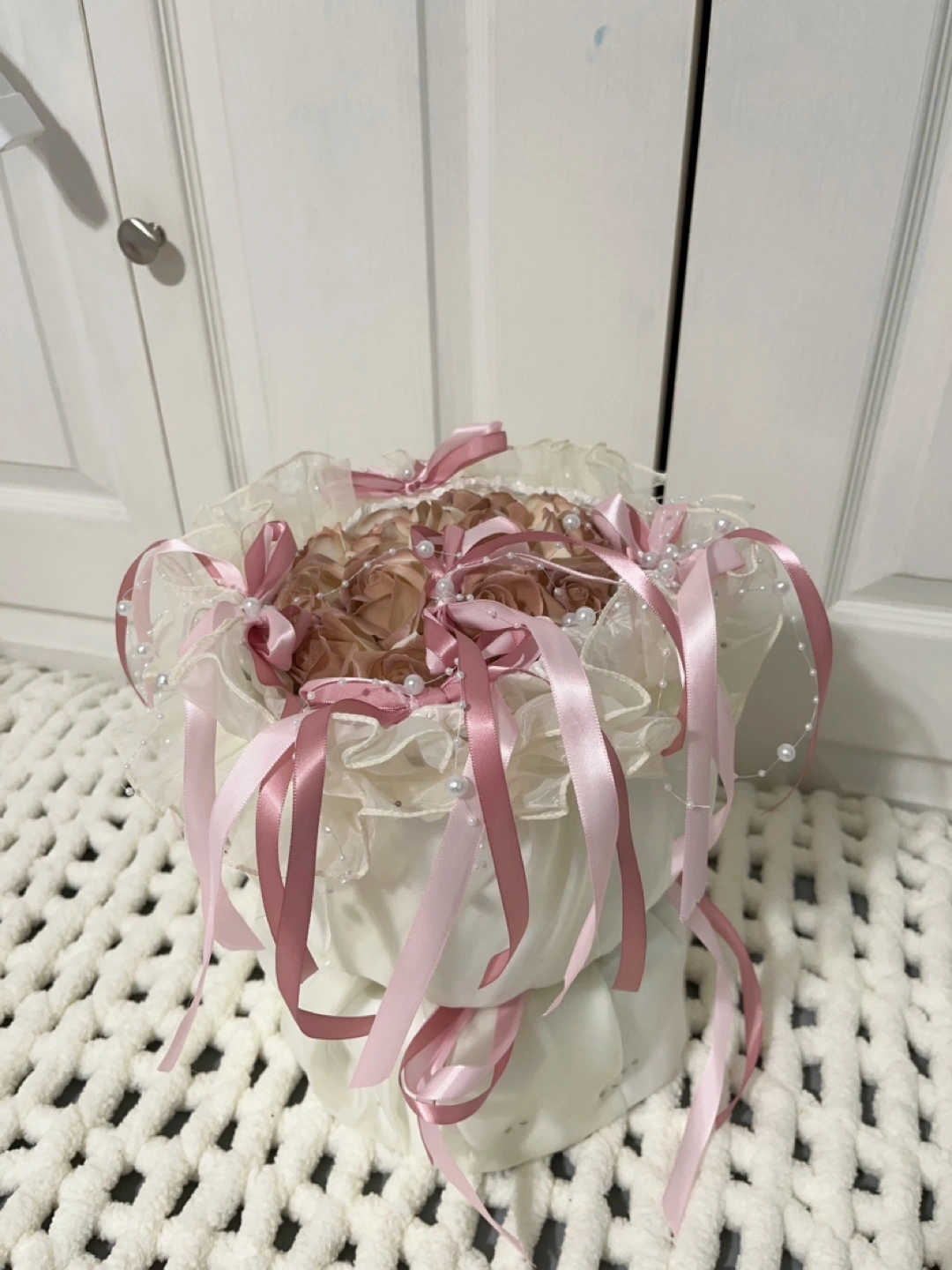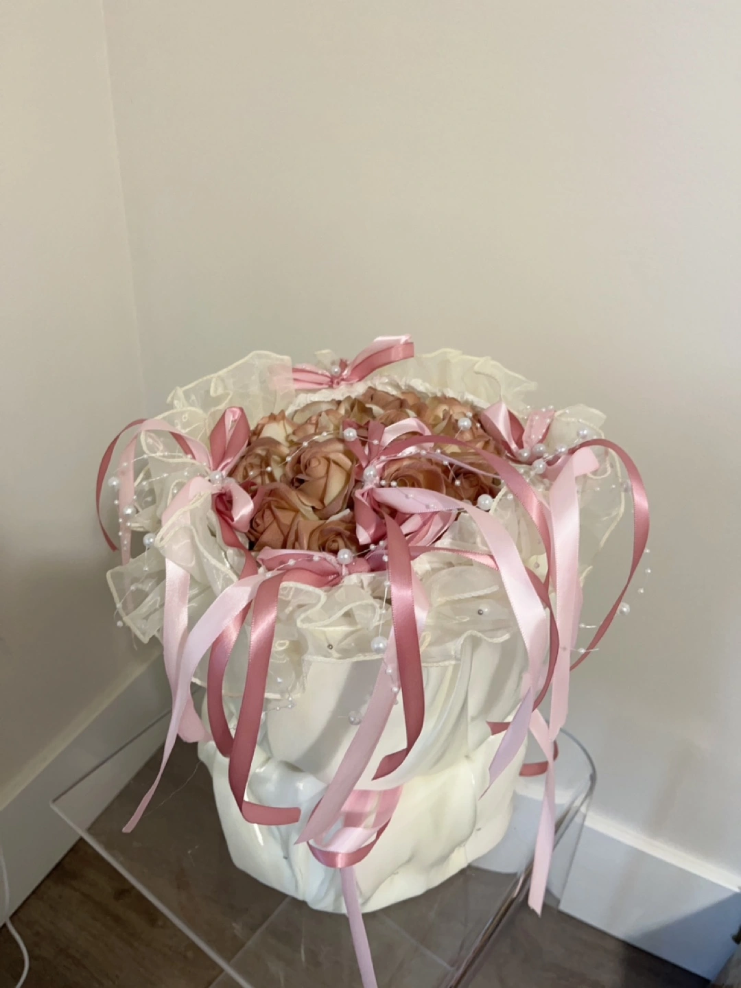 Beautiful artificial rose bouquet. Pink and mauve roses arranged in a white pot. Decorated with ribbons and pearls. Perfect for weddings or home decor.