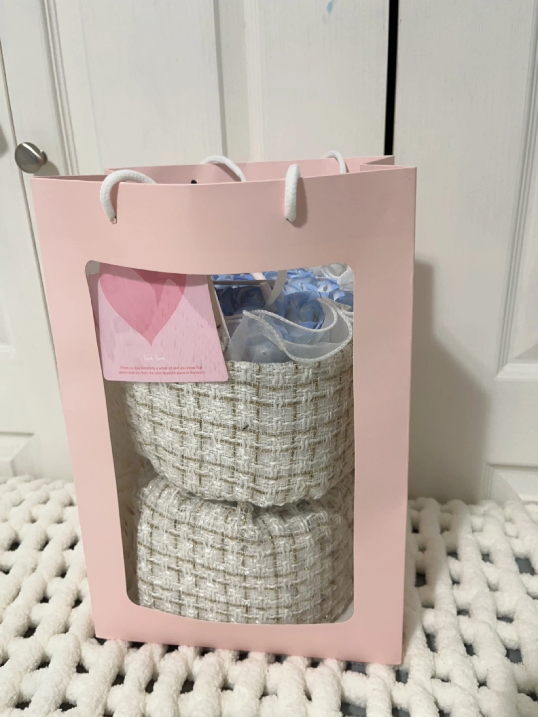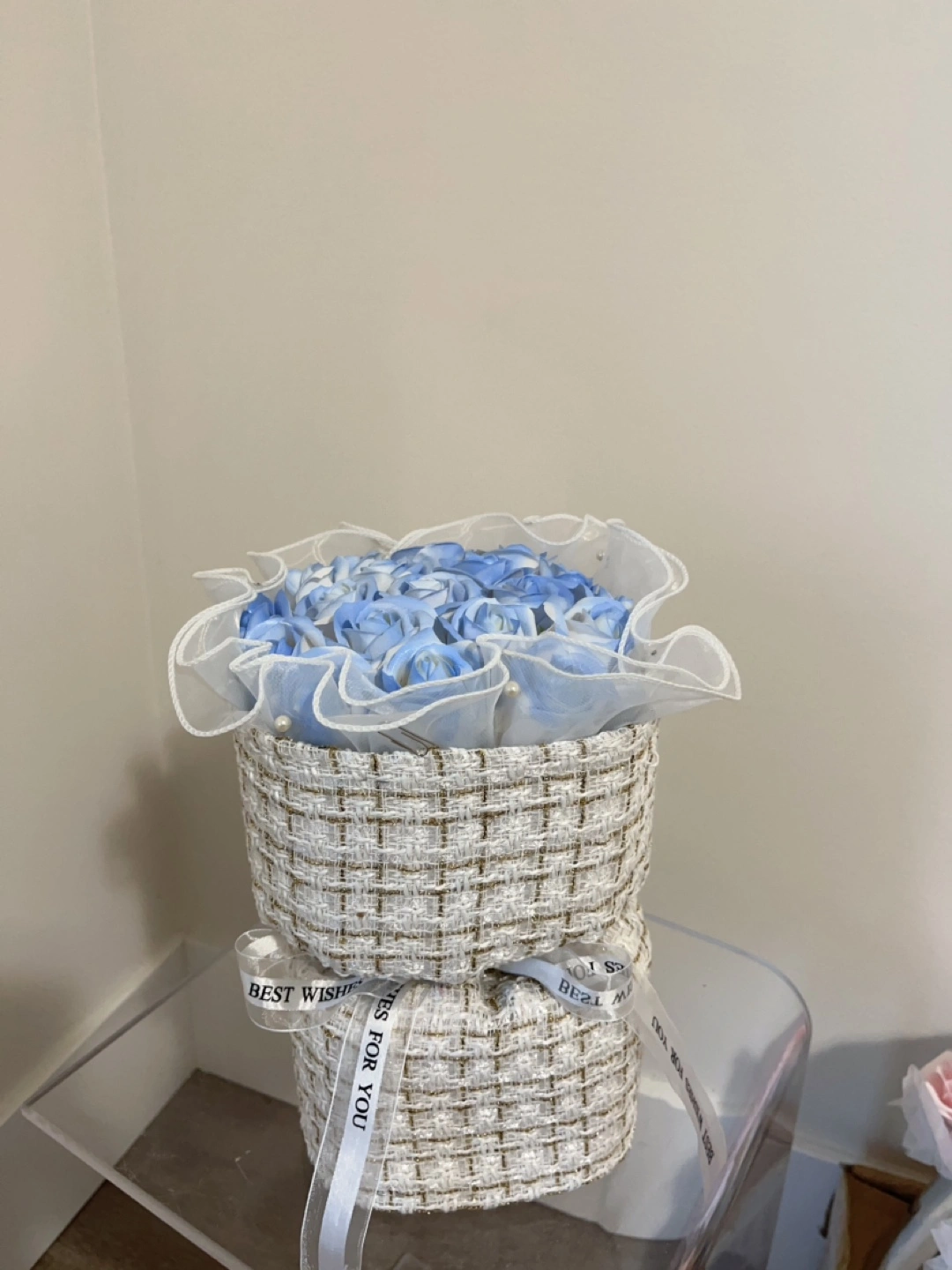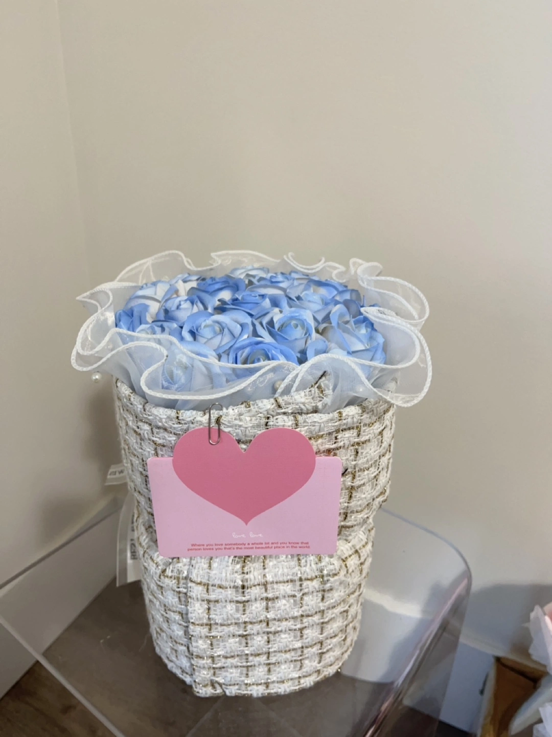 Lovely arrangement of light blue artificial roses. Presented in a woven basket with a sheer fabric overlay. Comes with a pink gift bag. Perfect gift.