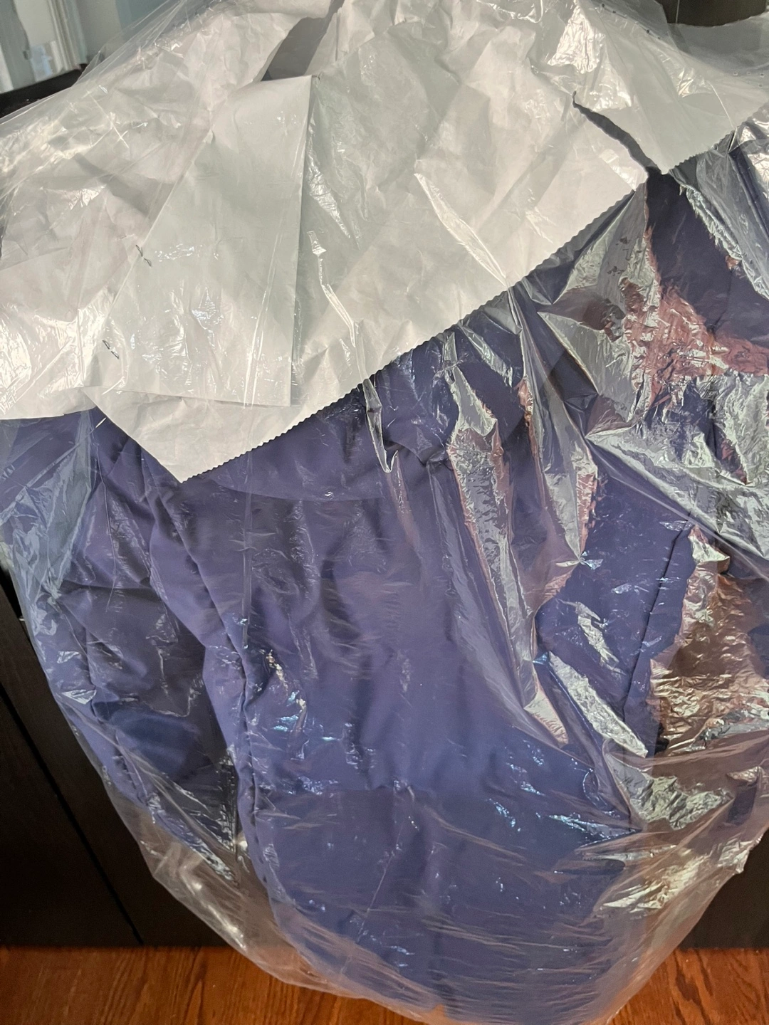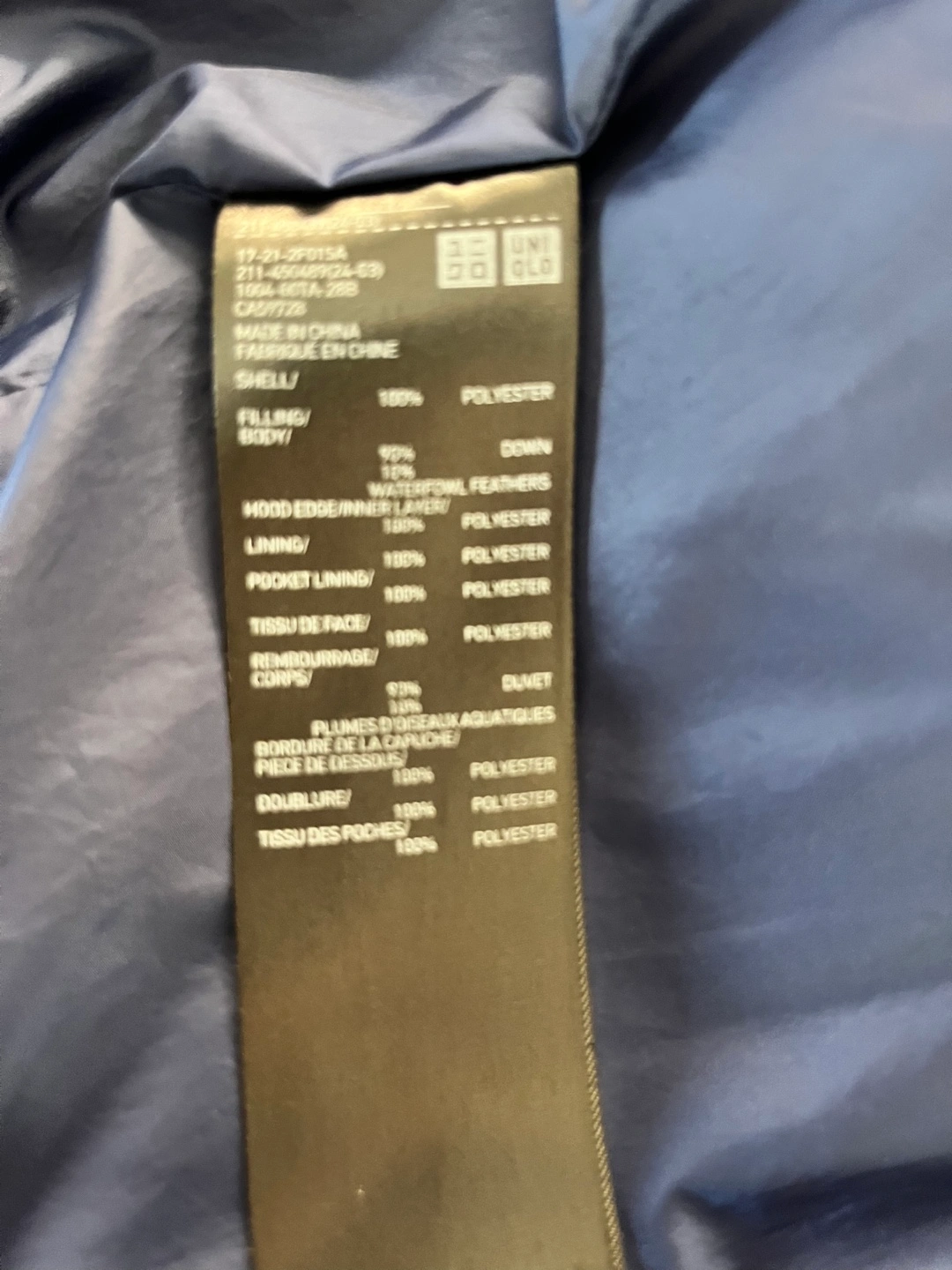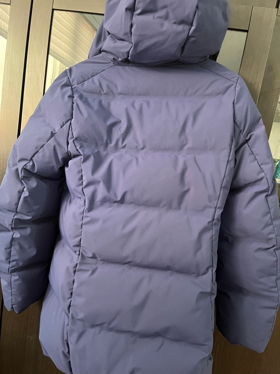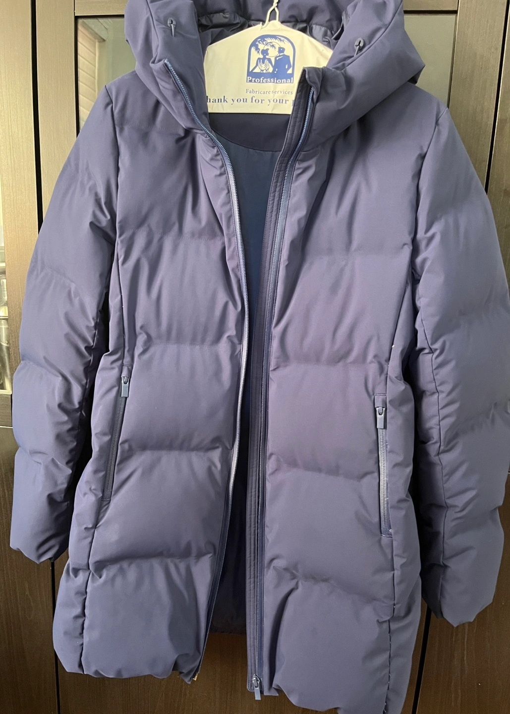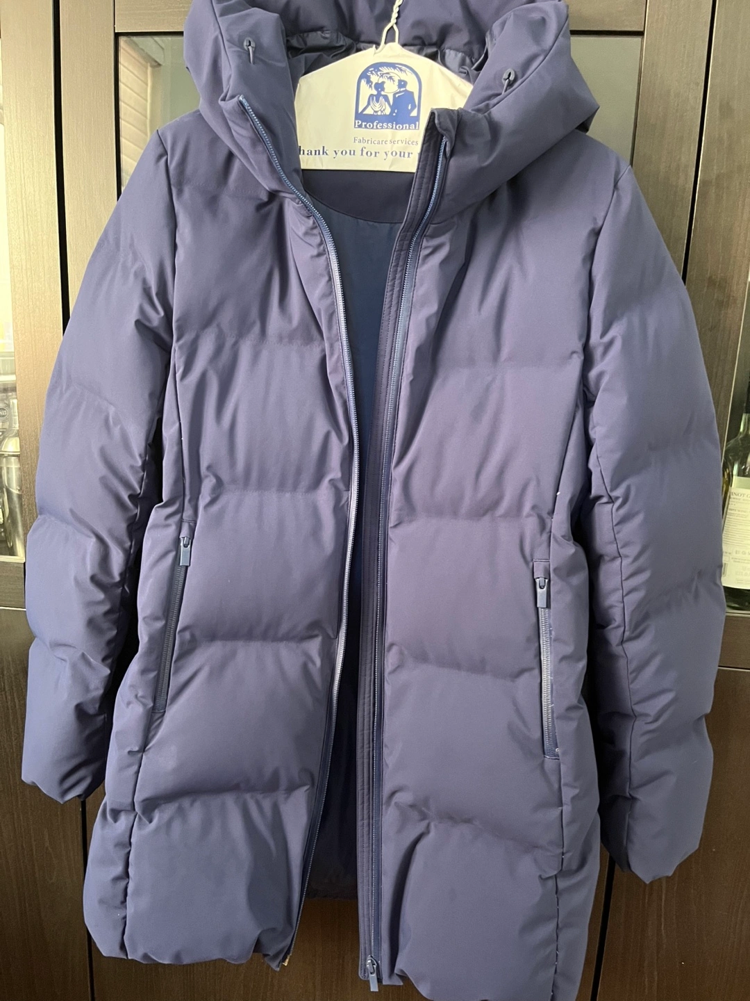 Warm hooded down jacket. Features a zipper closure and side pockets. Excellent for cold weather. Made in China.