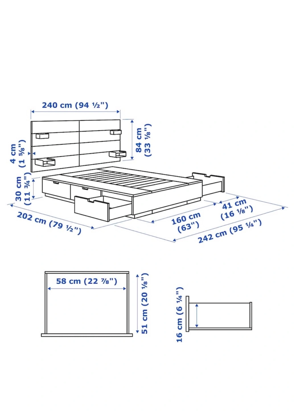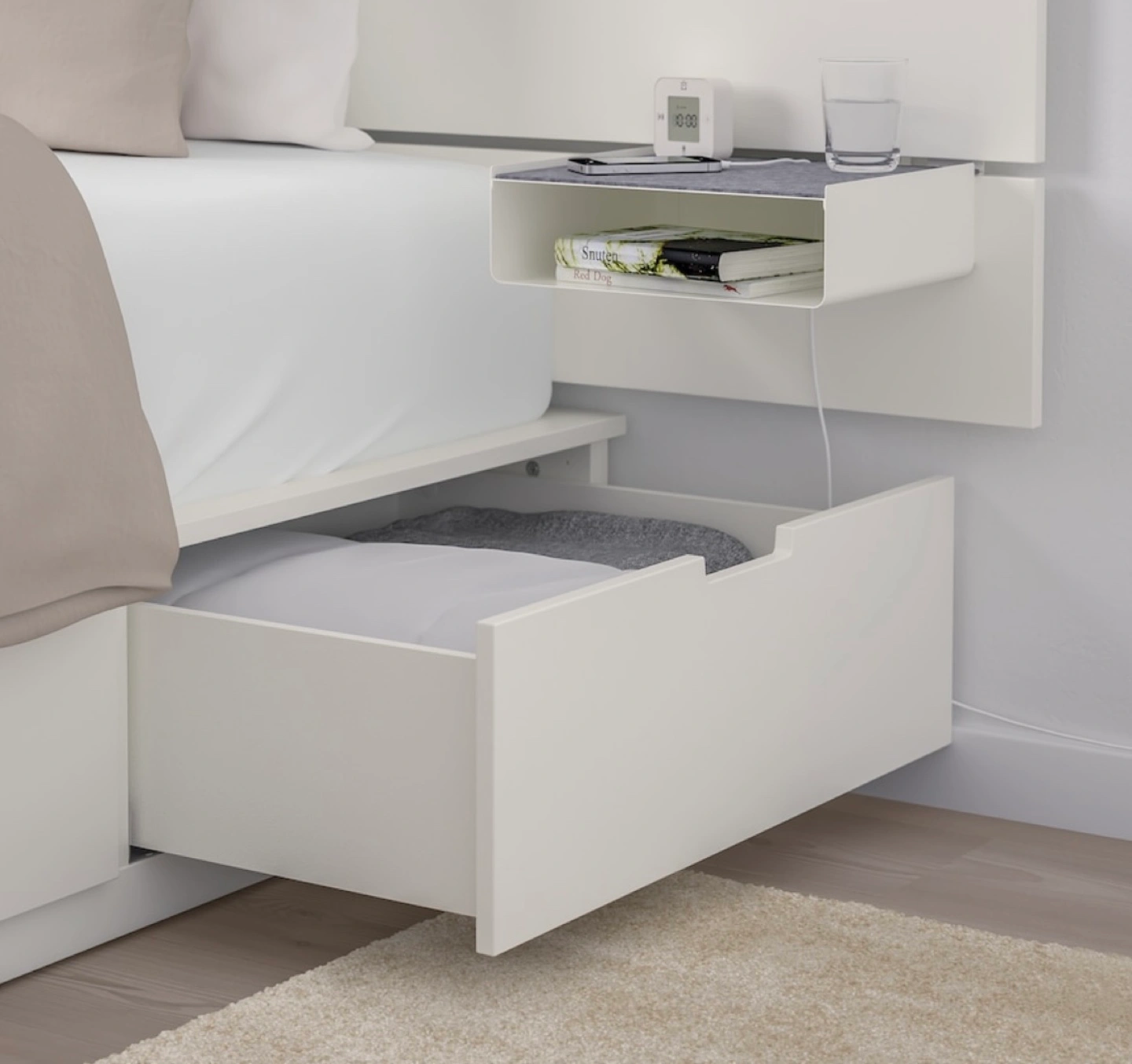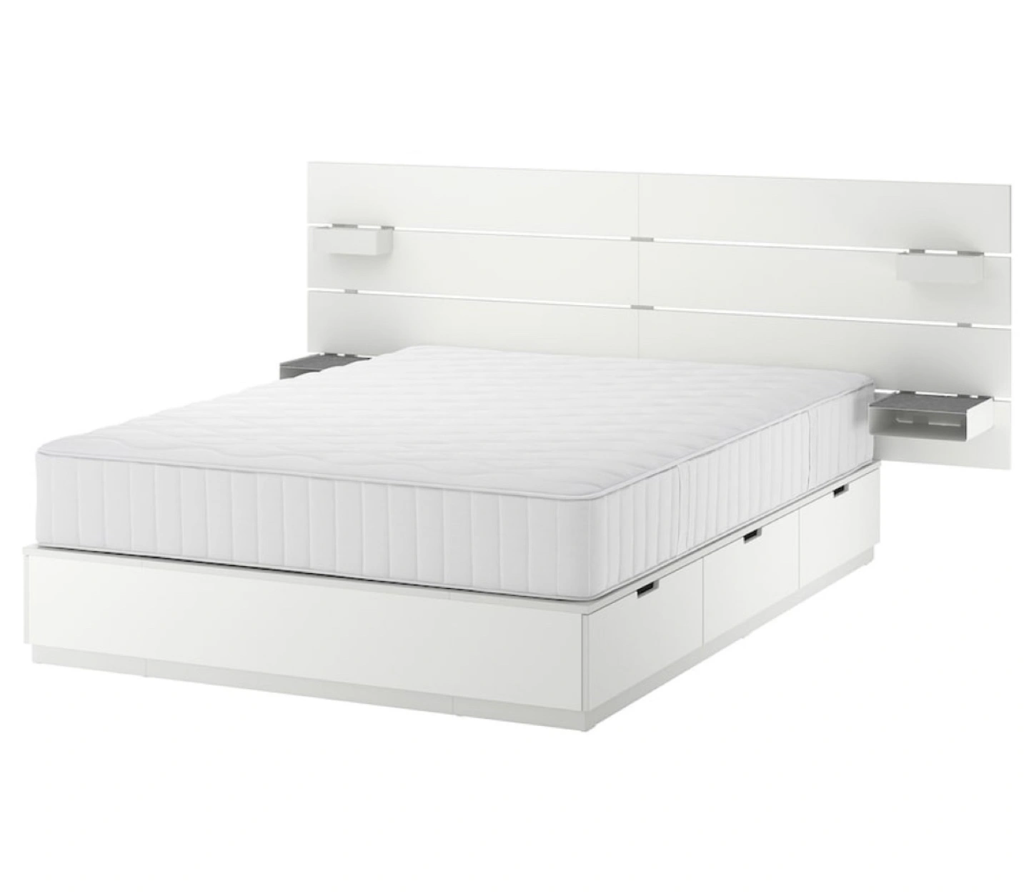 White queen size bed frame. Includes headboard with integrated shelves and six large drawers for storage. Minimal assembly required. Excellent condition.