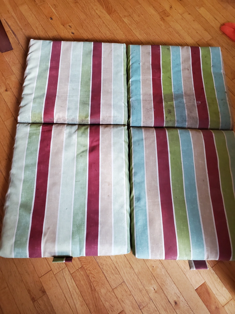 Set of four striped patio chair cushions. Multicoloured stripes in red, green, beige and teal. need a good machine wash washable material