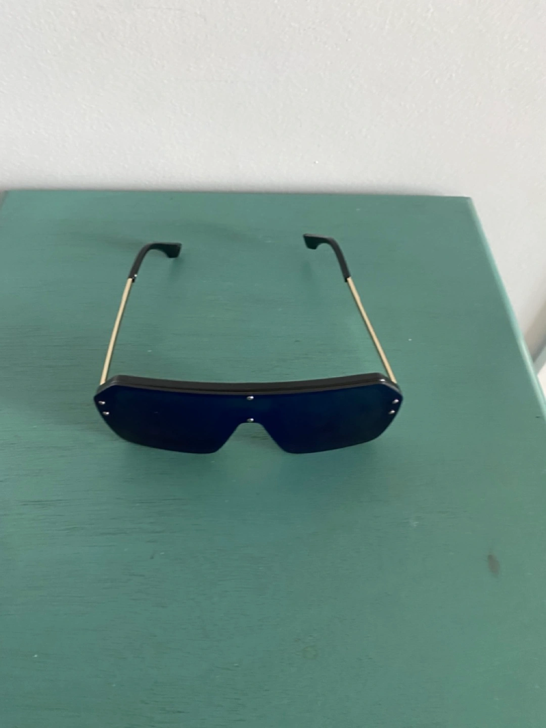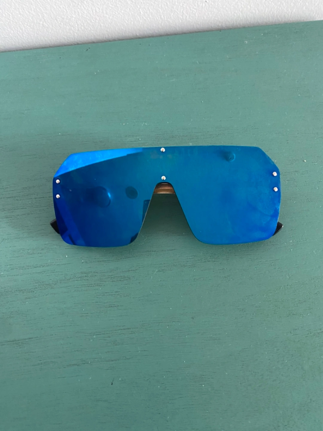 Large, shield-style sunglasses. Features blue mirror lenses. Gold-toned arms.