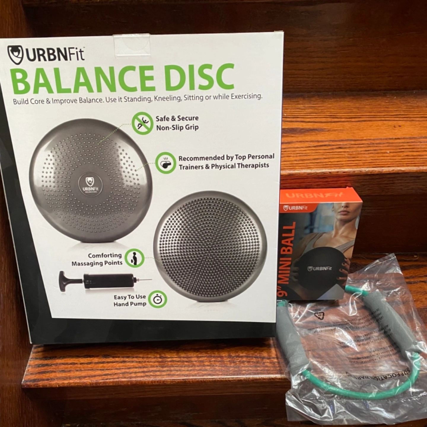 URBNFIT Fitness Pack - Three Items balance disc improves balance and core strength. Use while standing, kneeling, sitting, or exercising. Features a non-slip grip and massaging points. Includes easy-to-use hand pump. Also includes a URBNFIT 800G mini exercise ball and Hand band. Great for workouts and physiotherapy. Cash only