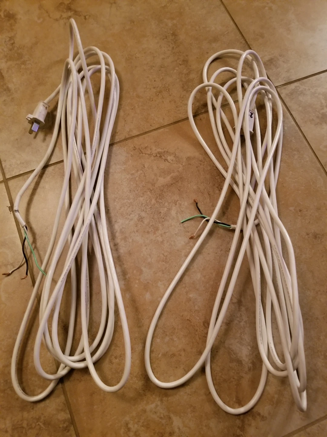 18 guage 3-wire (hot, neutral + ground) cord. 2 pcs at 22' each. used but in excellent condition. The other end simply needs to be hardwired to a fixture.