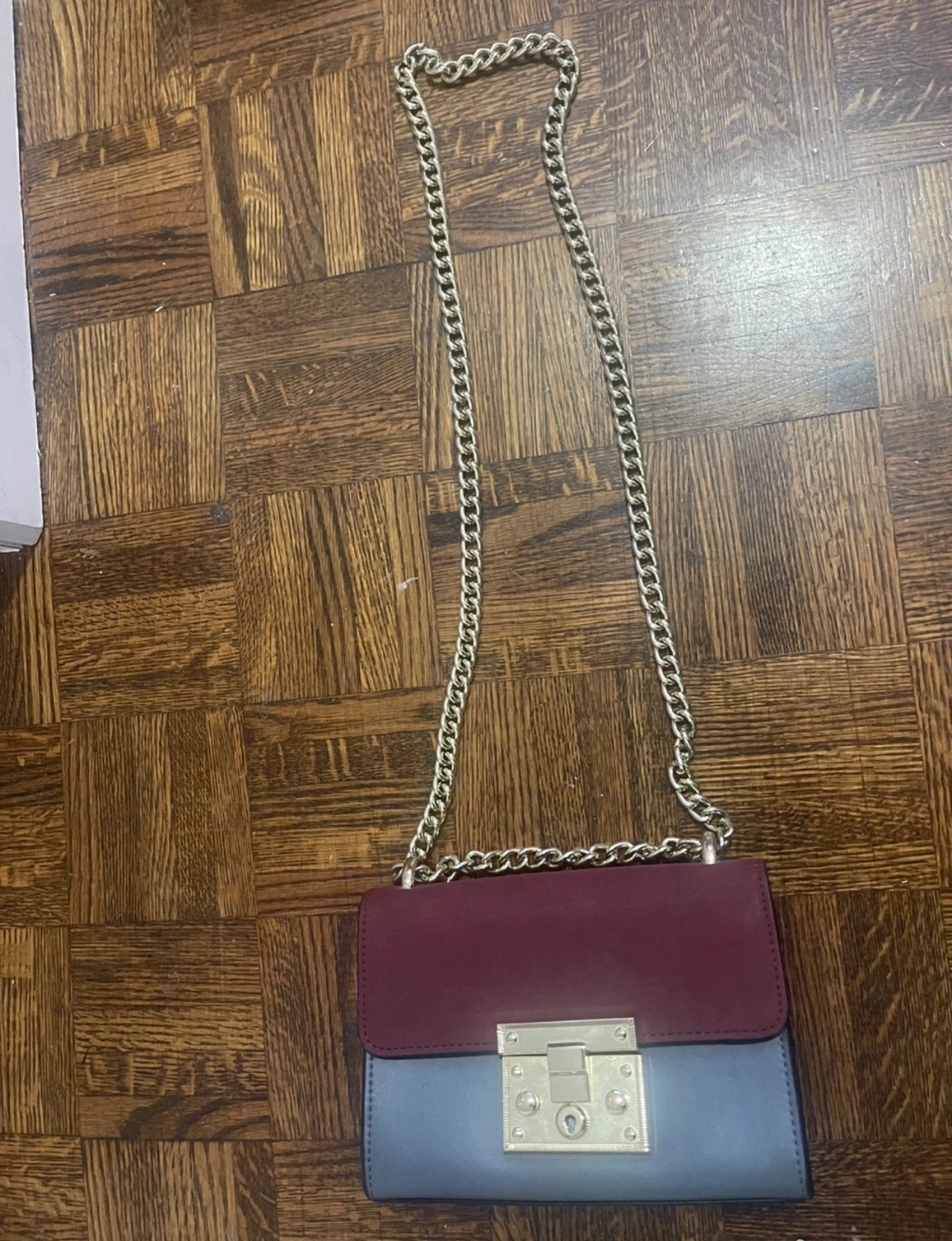 Small crossbody bag. Features two-toned design, burgundy and grey. Gold chain strap and clasp. Perfect for everyday use.