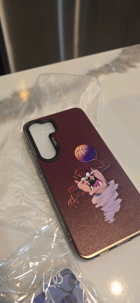 New phone case(samsung S24). Features Taz from Looney Tunes playing basketball. Burgundy colour. Slim and protective, and unused.
