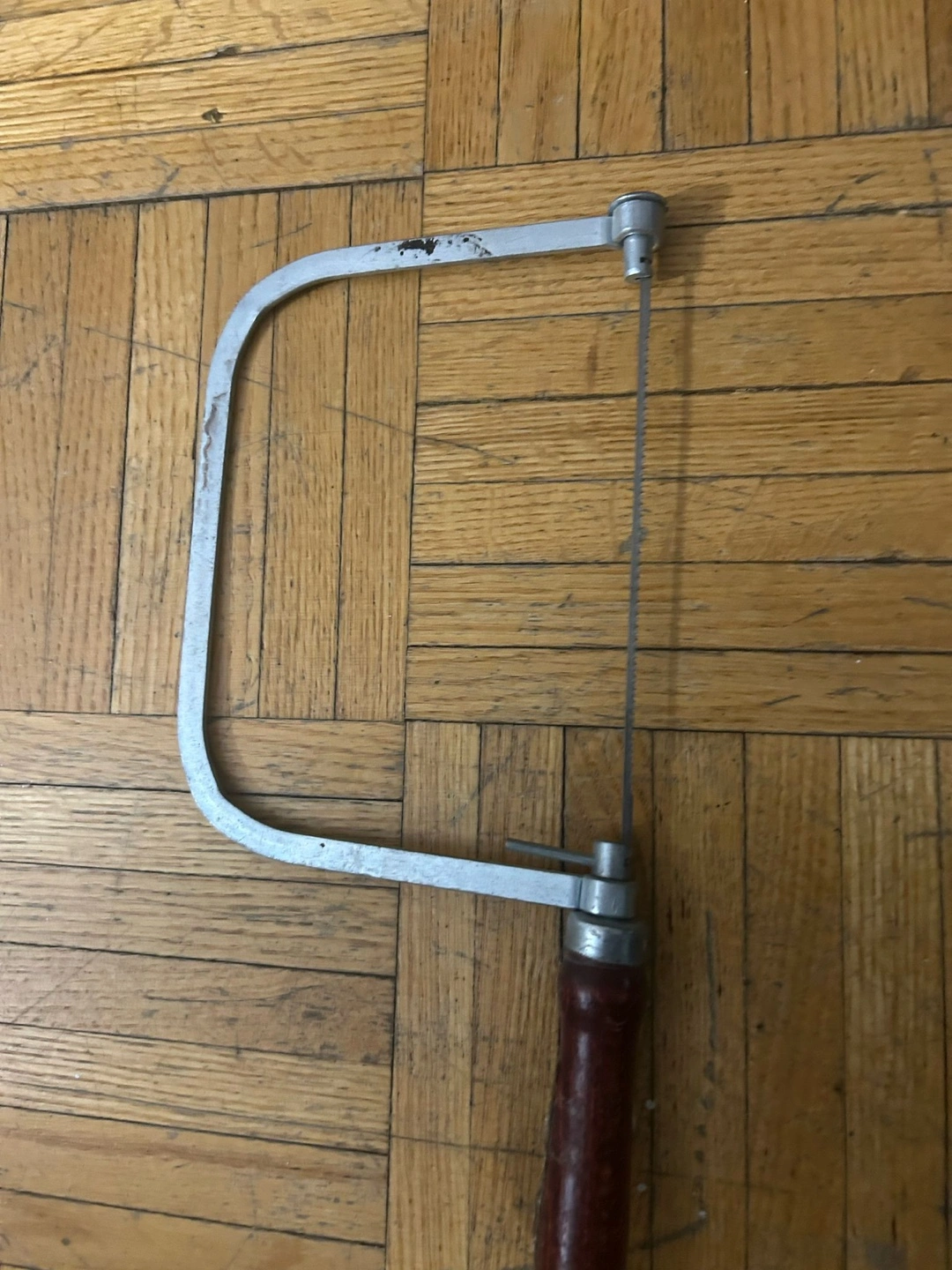 Used coping saw. Metal frame, wooden handle. Shows some signs of wear.