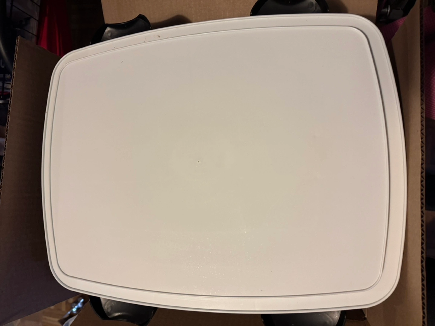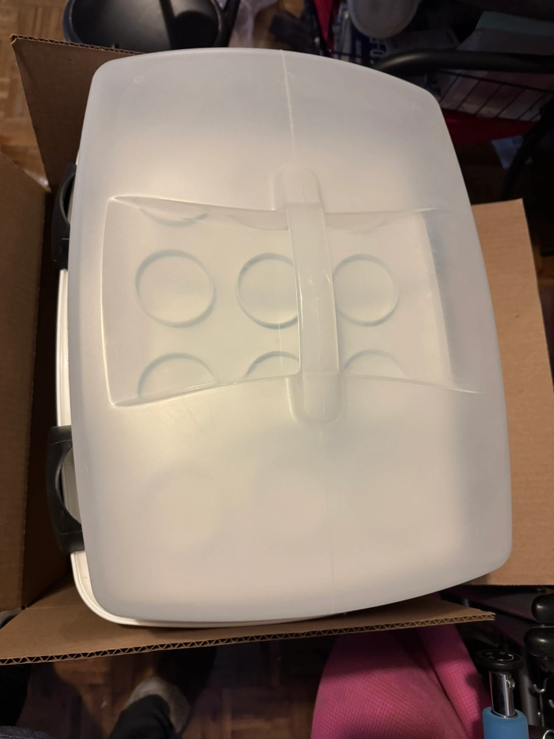 White plastic cupcake carrier holds 12 cupcakes and includes a clear lid, making it perfect for transporting baked goods. It can also accommodate a large cake slab or 24 mini cupcakes. The secure lid snaps shut, keeping your treats safe and fresh. Ideal for parties or organizing your kitchen, this container offers convenience and peace of mind. Pick up Bloor St W & The East Mall